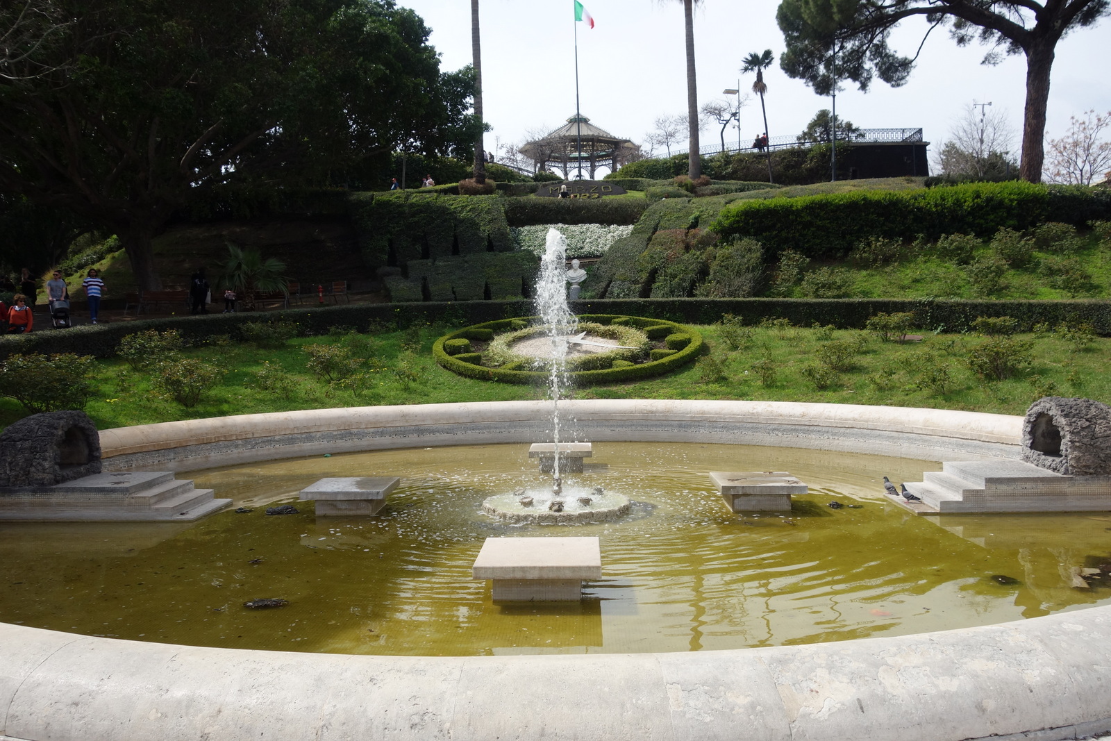 Der Bellini-Park ist eine recht große Angelegenheit mit mediterranem Gewächs, alles zu Ehren dieses Bellini, von dem wir mittlerweile ja auch wissen wo er begraben ist und zu der unbekannten Leiche in diesem Glaskasten einen Namen haben. Nur einen kleinen Teil vom großen Park gönnen die uns zu sehen, der Spielplatz wird totgeschwiegen und von nun ab geht`s bergab.