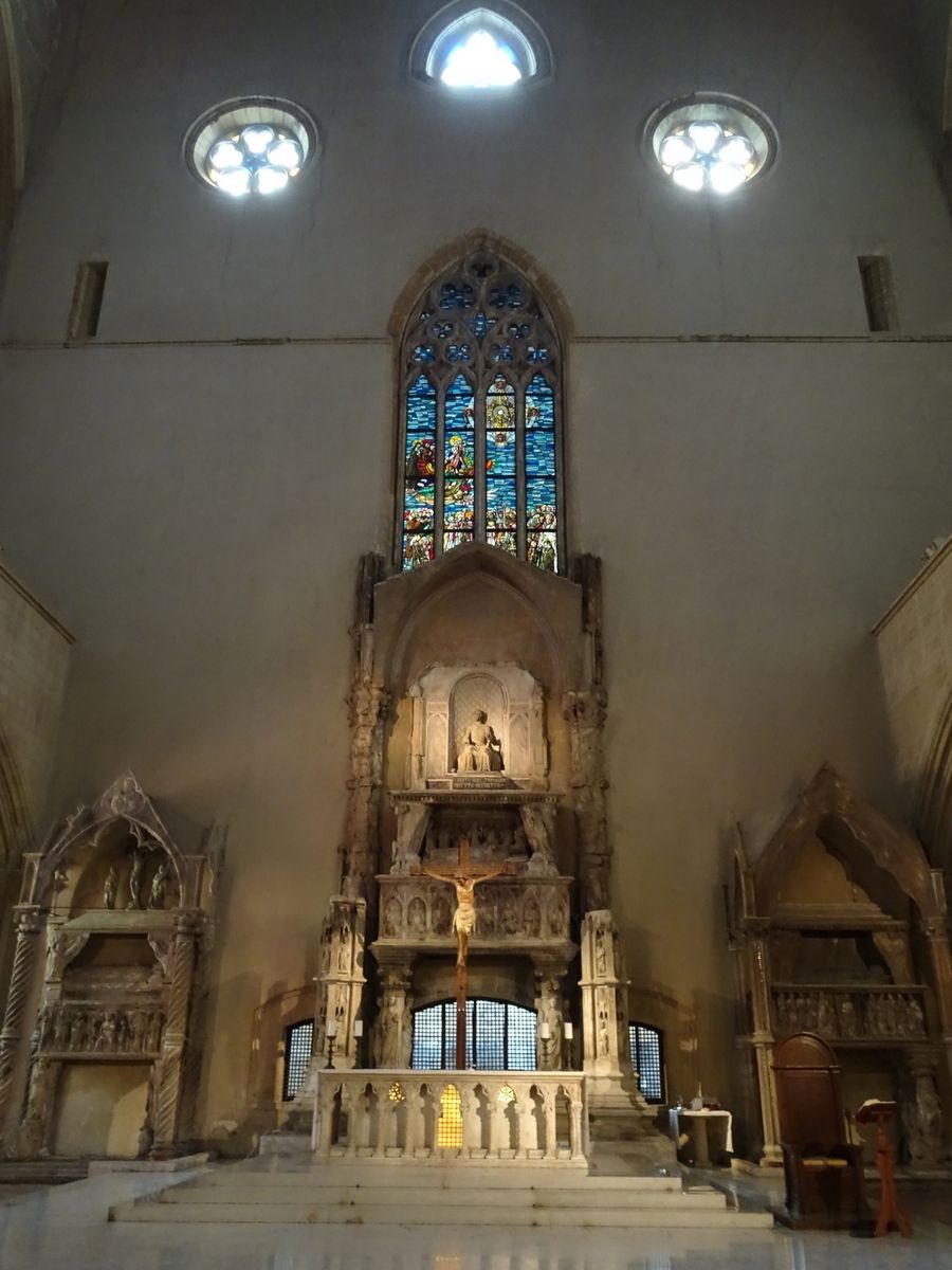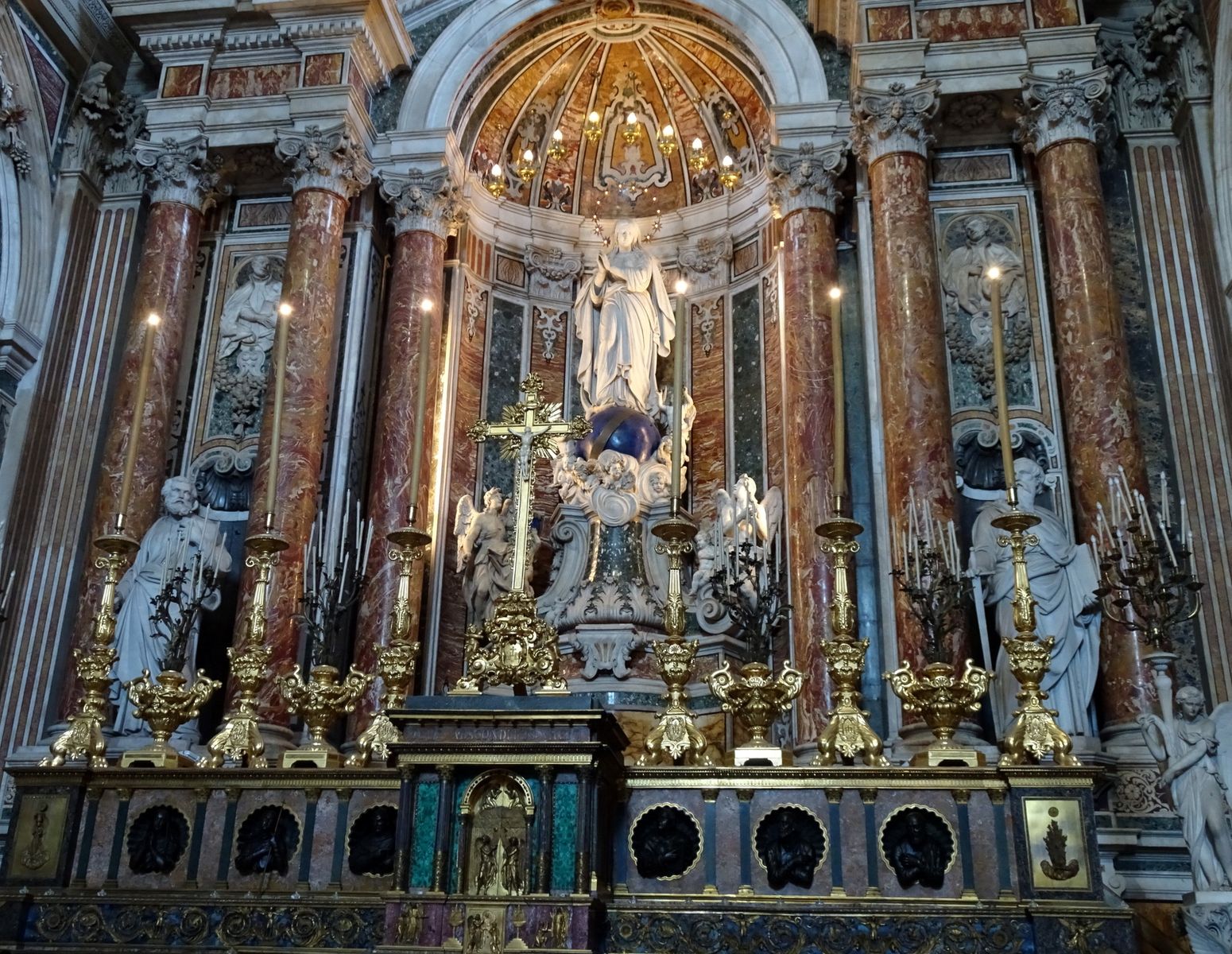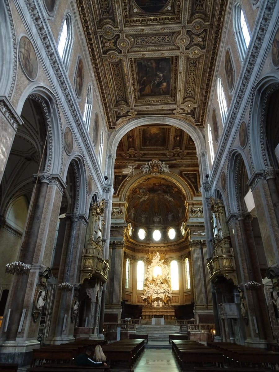 werden angeblich 2 Ampullen geronnenes Blut vom Heiligen San Gennaro aufbewahrt. Das hatte man aufgefangen, nachdem man ihm vor 1700 Jahren den Kopf abgeschlagen hat. Der Märtyrer ist in Neapel der Schutzpatron und 3 Mal im Jahr geschieht hier im Dom das „Blutwunder“. Die Ampullen werden hervorgeholt, der Kardinal dreht und schüttelt sie, die Kirche ist brechend voll und im Idealfall wird die vorher braune Sache rubinrot und flüssig. Kann aber dauern…
