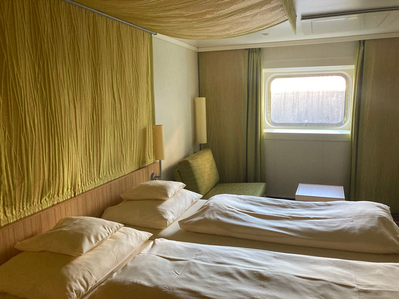 Es ist eine MA Kabine, um einiges größer als die Innenkabine, und sie hat noch einen Schlafsessel dabei. Das mit dem Fenster gefällt uns wirklich gut, und zack, gehört sie uns.