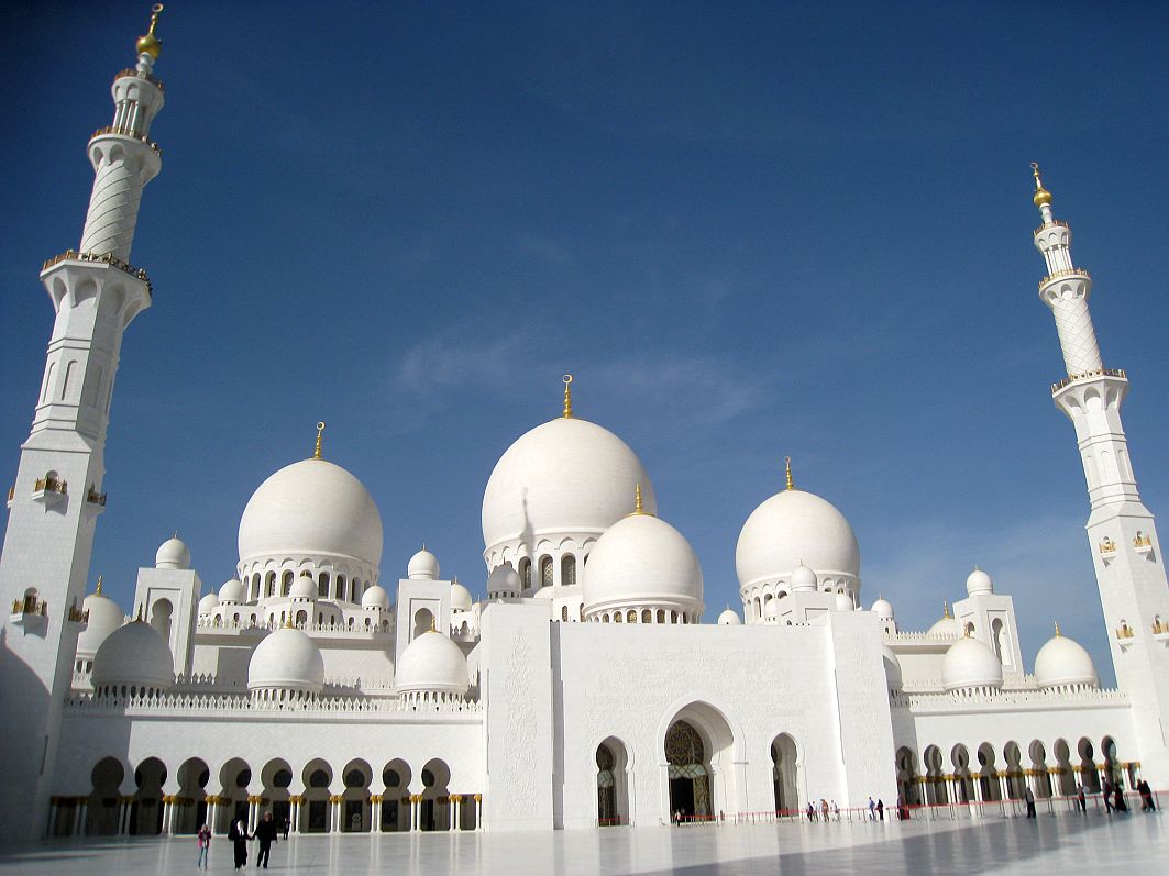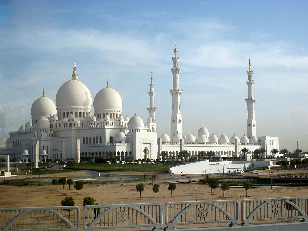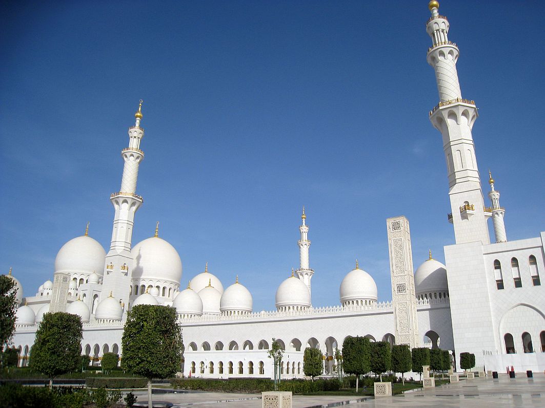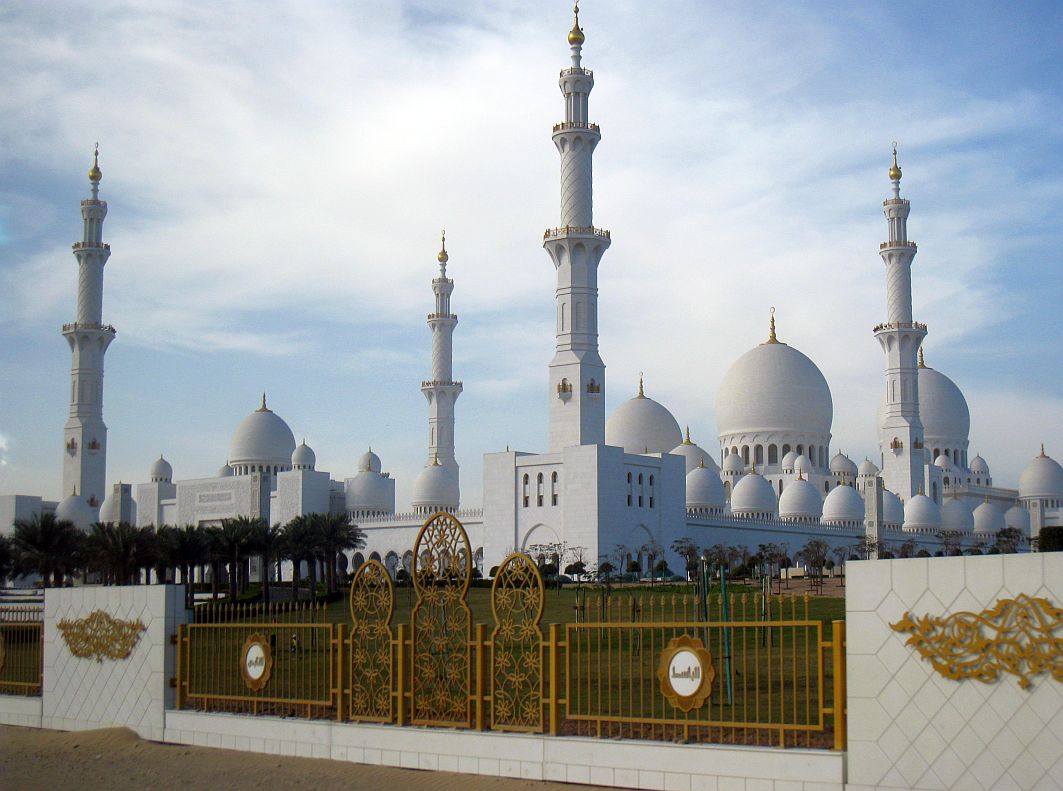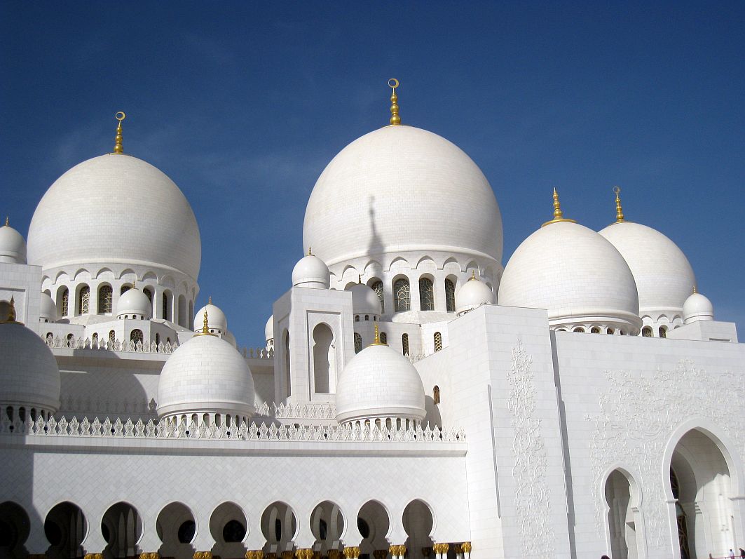 Was soll man sagen?! - Eine Moschee der Superlative, deren vollständiger wohlklingender Name „Sheikh-Zayed-Bin-Sultan-Al-Nahyan-Moschee“ lautet: Rund 40.000 Gläubigen bietet das rund 224 mal 174 Meter große Bauwerk Platz. Vier Minarette mit jeweils einer Höhe von 107 Metern. Die Hauptkuppel über dem Gebetssaal der Männer hat eine Höhe von 75 Metern und einen Durchmesser von über 30 Metern und gilt damit als weltweit größte Moscheekuppel. 15 verschiedene Marmorsorten und jede Menge Blattgold wurden verarbeitet.