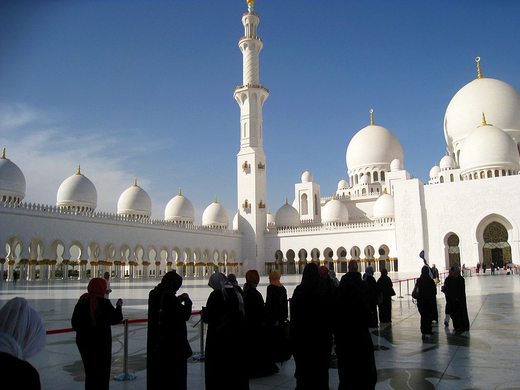 Doch der Zutritt für Frauen führt an einem „Umstyling“ zunächst nicht vorbei. Wir werden in einen Raum mit vielen Regalen gebeten, die mit tiefschwarzen Abayas gefüllt sind, jenen arabischen Frauengewändern, unter denen die Figur vollkommen verschwindet. Selbst Größe S war mir einen gefühlten halben Meter zu lang, dafür stimmte wenigstens die Ärmellänge, deren Abschluss am rechten Arm wenigstens etwas aufgewertet wurde durch eine goldfarbene Stickerei. Zwar kann man sich dort Kopftücher ausleihen, doch darauf verzichteten dann die meisten Frauen und griffen auf ihre mitgebrachten Tücher zurück, die den einheitsfarbenen Gewändern wenigstens einen kleinen Farbtupfer verliehen.