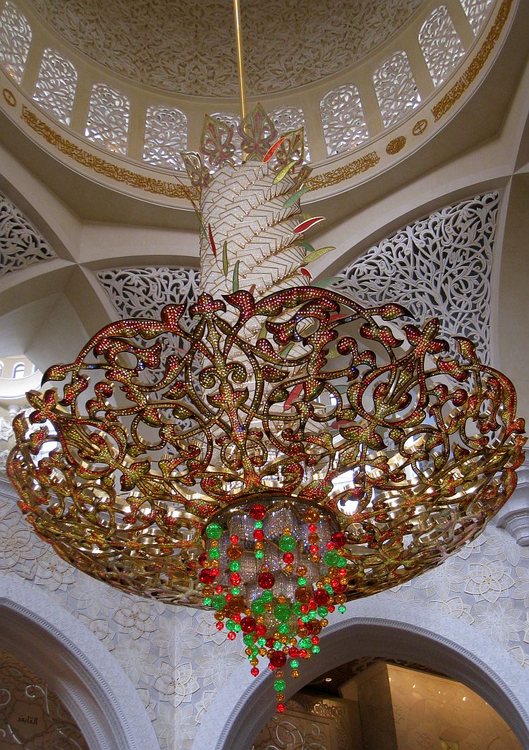 Sieben Kronleuchter schmücken das Innere der Moschee. Messing und Edelstahl wurden aus Deutschland importiert. Tausende verschiedenfarbige Swarovski-Kristalle zieren diese unermessliche Pracht.