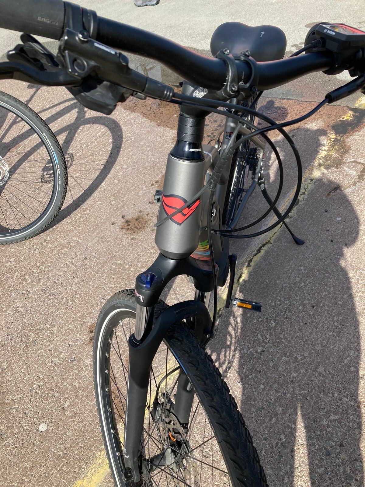 Ich habe einen kleinen Schreckmoment, als ich einem Schlagloch ausweiche und mitsamt E-Bike umfalle.