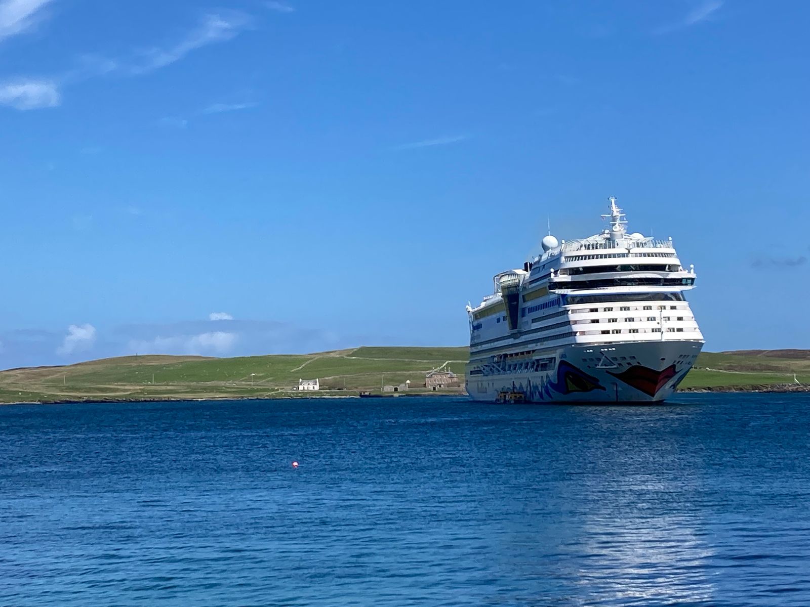 Das Einlaufen in Lerwick ist ein wenig trübe, allerdings versüßt ein zarter Regenbogen den ansonsten etwas tristen Anblick.
