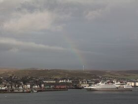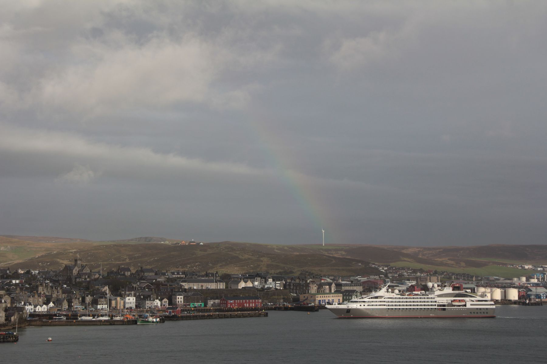 Das Einlaufen in Lerwick ist ein wenig trübe, allerdings versüßt ein zarter Regenbogen den ansonsten etwas tristen Anblick.