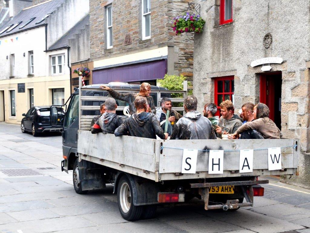 Es war ein Jungesellen/-innenabschied! Braut und Brautjungfern. Sie bliesen in Trillerpfeifen, was das Zeug hielt. Ohrenbetäubend! Dann der Folgewagen. Wie die Mädels sahen Bräutigam und seine Kumpel ein wenig abseits der Norm aus.