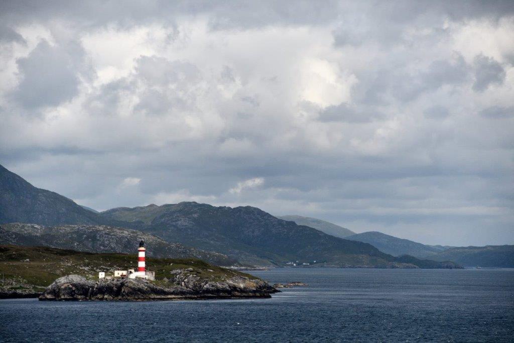 Das Wetter? Herrlich! Kein Braten im Sonnenschein wie in den letzten Wochen zu Hause sondern angenehme 14°. Windstärke 10. Sonne, Wolken, zwischendurch ein sehr, sehr kurzer Schauer, den wir unter dem Baldachin der Außenalster absaßen. Die Inseln der Äußeren Hebriden verließen uns nicht. Sie strahlten uns mit ihren unterschiedlichen Grüns an. Auf einigen Inseln im Verhältnis zu ihrer Größe recht hohe Berge. Ab und zu weiße Tupfer: Häuser! Und dann auf der Insel Scalpay der Eilean Glas Lighthouse – ein klitzekleiner Farbkontrast!