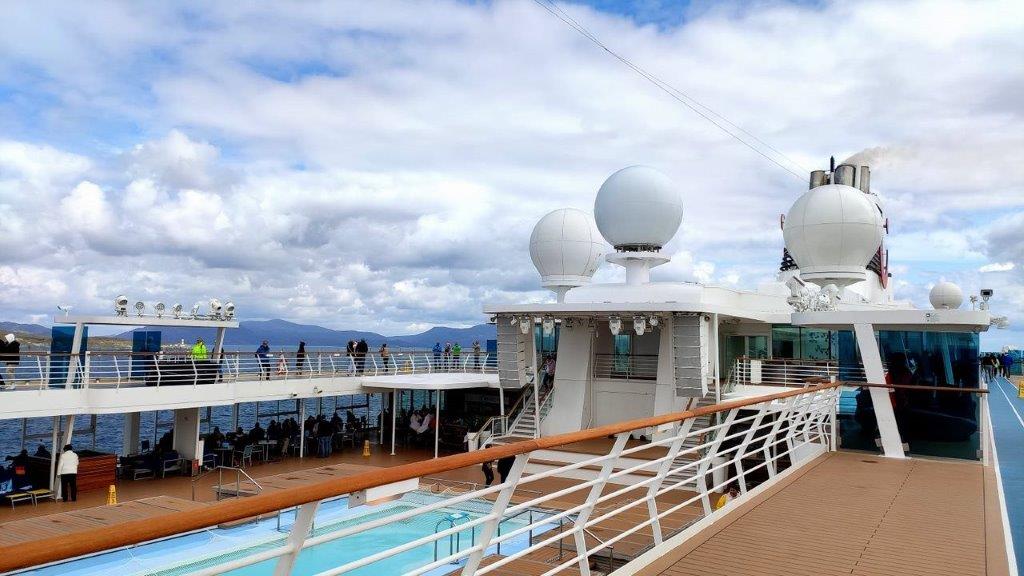 … von denen wir nichts Negatives mitbekommen hatten. Anzeichen gab es für uns im Nachhinein: Spuckbeutel hingen im Treppenhaus, wie ich auf meinem Weg nach oben erkannte. Auf Deck 14 angekommen, bekam ich bei meinem obligatorischen Morgenkaffee „Land in Sicht“ mit. Und zwar auf beiden Seiten des Schiffes. Wir waren also mittendrin in der Hebridenpassage. Auf der Backbordseite das schroffe schottische Festland; auf Steuerbord die Insel Lewis and Harris, die uns länger begleiten sollte.