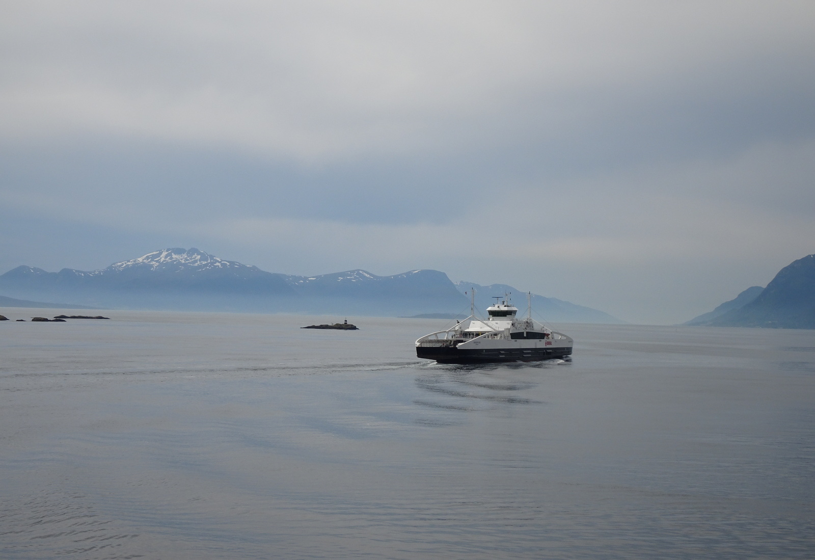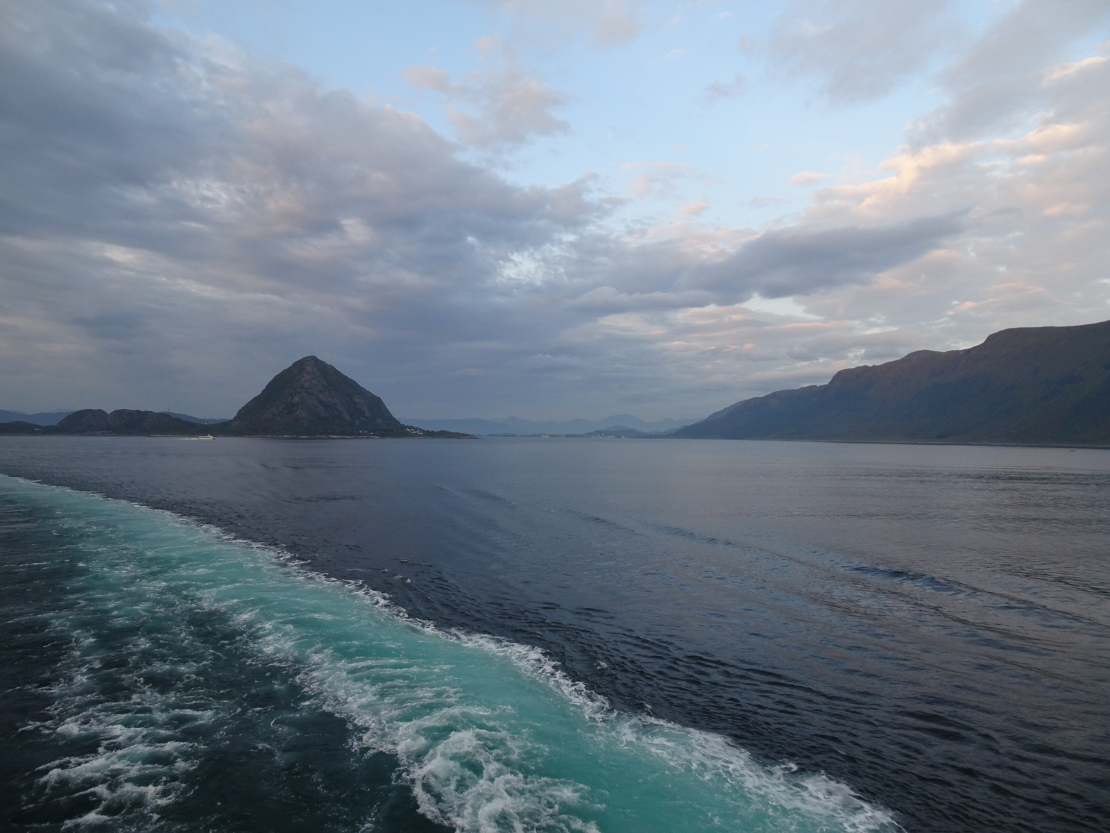 Lang ist die Fahrt aus dem Fjord, 3 ½ Stunden Mischung aus Hochgebirge, Mittelgebirge, kleine Felsinseln, flache Wiesen und eine nahezu spiegelglatte See.