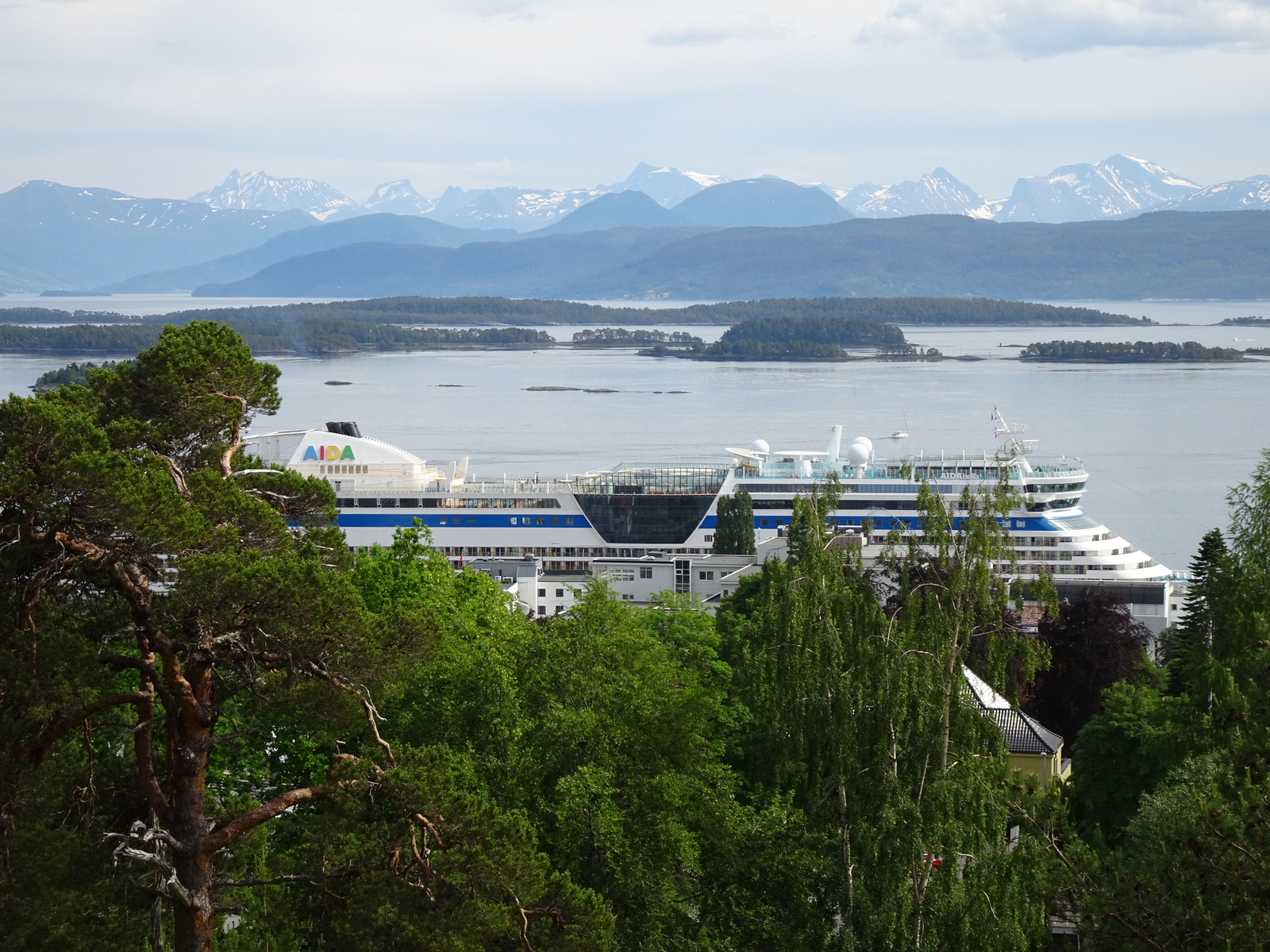 Aber nicht mal das stimmt, denn zwar kann man Molde und auch ein Konkurrenzschiff schon sehen, aber durch die kleinen Inseln vor uns kommen wir nicht durch, müssen erstmal an deren Ende unten einfädeln.
