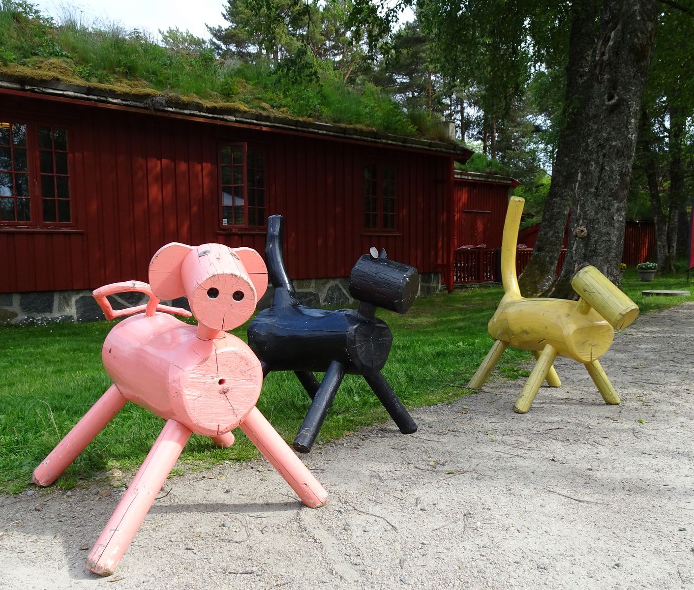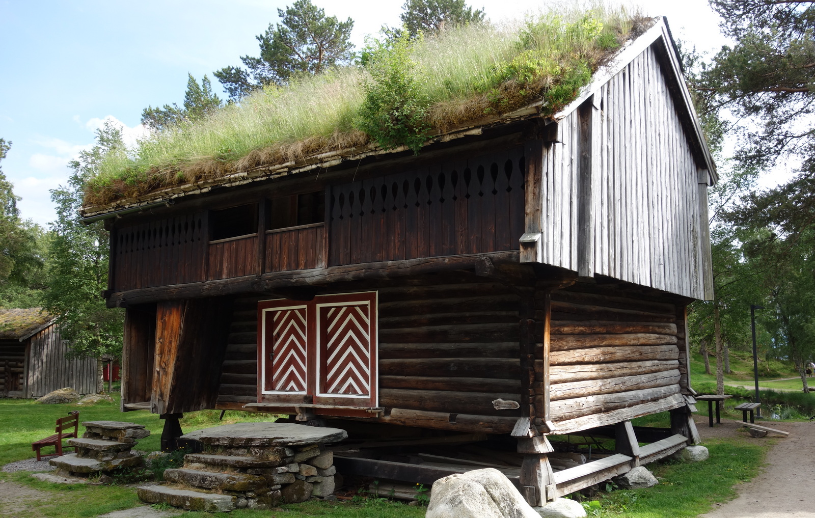 Kleiner Spaziergang zum Freilichtmuseum Romsdal. Dass es teils ordentlich bergauf geht, war mir schon vorher klar und denen wird es jetzt gerade klar. Aber so weit ist es nun auch wieder nicht. Ist eigentlich der gleiche Weg wie zum Panoramablick auf den 400 m hohen Berg Varden, nur nicht so weit. Für uns muss der Panoramablick aus etwa 100 m Höhe reichen. Diesen Pavillon haben wir und zig andere gerade erreicht.