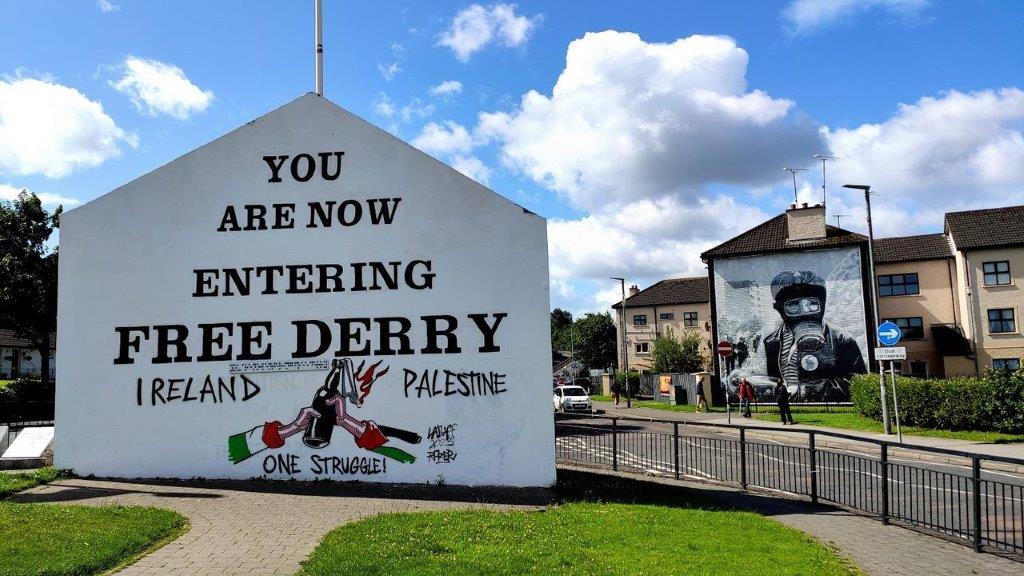 Eine Giebelmauer eines abgerissenen Wohnhauses in Sichtweite der Stadtmauer; ein ehemaliges Wohnhaus an der „Grenze“ des katholischen/republikanischen Bezirks Bogside und der ehemals protestantischen/unionistischen Teile von Belfast. In nordirischen Städten – insbes. in Belfast und Derry – fertigten seit Anfang des letzten Jahrhunderts beide Fraktionen Wandmalereien, die Murals, um ihre Gegner mit mehr oder weniger aggressiven Parolen und Gedenkhinweisen an ihre verstorbenen bzw. getöteten Anhänger einzuschüchtern. Also gegenseitige Politik an allen Ecken, die gerade an dieser „Demarkationslinie“ in der Vergangenheit oft eskalierte. Protestanten provozierten in dieser Gegend Katholiken mit ihren jährlichen Paraden anlässlich des Jahrestages des Endes der Schlacht am Boyne. Im August 1969 war es so weit – Katholiken nahmen die Provokation an und schlugen in der „Battle of the Bogside“ zurück. Sie dauerte drei Tage; getötet wurde zum Glück niemand, aber ca. 1.000 Menschen wurden verletzt. Dieses Ereignis war der Beginn einer fast 30jährigen Auseinandersetzung; außerdem löste sich die Verwaltung der Bogside drei Jahre lang von der der Gesamtstadt und stellte sich als autonom dar.