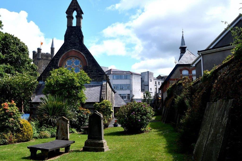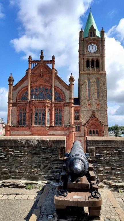 An einigen Stellen verstärkten Bastionen die Mauer. Auch ein Grund, dass sie in der Vergangenheit nicht zu bezwingen war. Immer wieder mussten wir stoppen und lauschten den Erklärungen des Reiseführers. Und hielten den Ausblick auf die Bogside, Free Derry Corner mit der Giebelwand von hinten/der Seite, den Murals und der St Eugene's Cathedral, der 1873 eröffneten „Mutterkirche“ der römisch-katholischen Diözese Derry, fest.