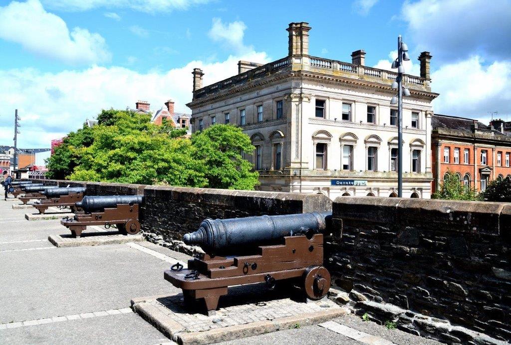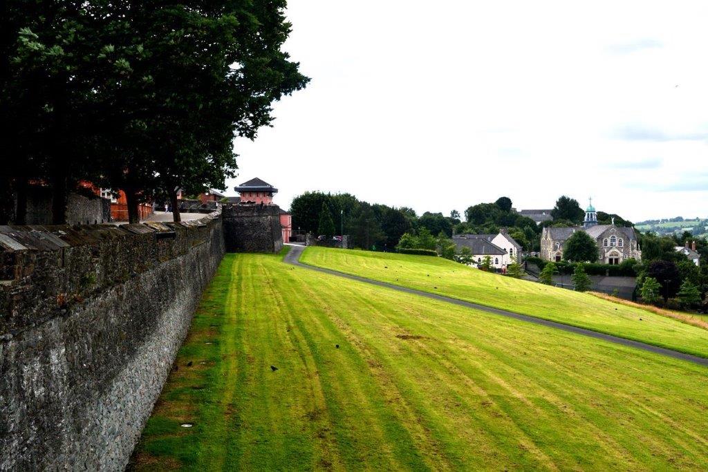 Genug der Erinnerung an die Zwischenmahlzeit – es begann der Rundweg auf der Stadtmauer, die wir am Shipquay Gate „bestiegen“. Gut 1,5 km ist sie lang, sechs Meter hoch. Angelegt wurde sie Anfang des 17. Jahrhunderts und zwar vorwiegend aus Steinen von zerfallenen Klostergebäuden. Bei dem Volumen mussten es viele große Klöster gewesen sein ... Londonderry wurde einige Male lang andauernd belagert – die Mauern hielten immer stand. Gute, alte englische Wertarbeit.
