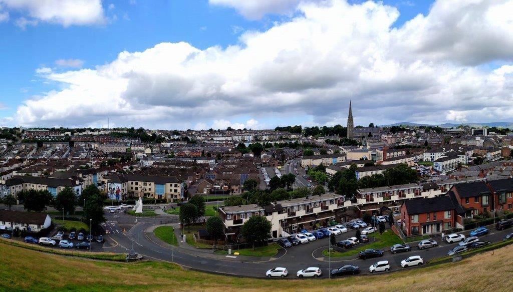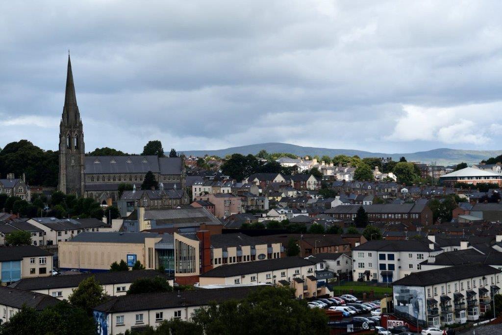 Bevor wir uns der nächsten Kirche widmen ein Abschieds-Überblick auf die Bogside mit der alles überragenden St Eugene's Cathedral.