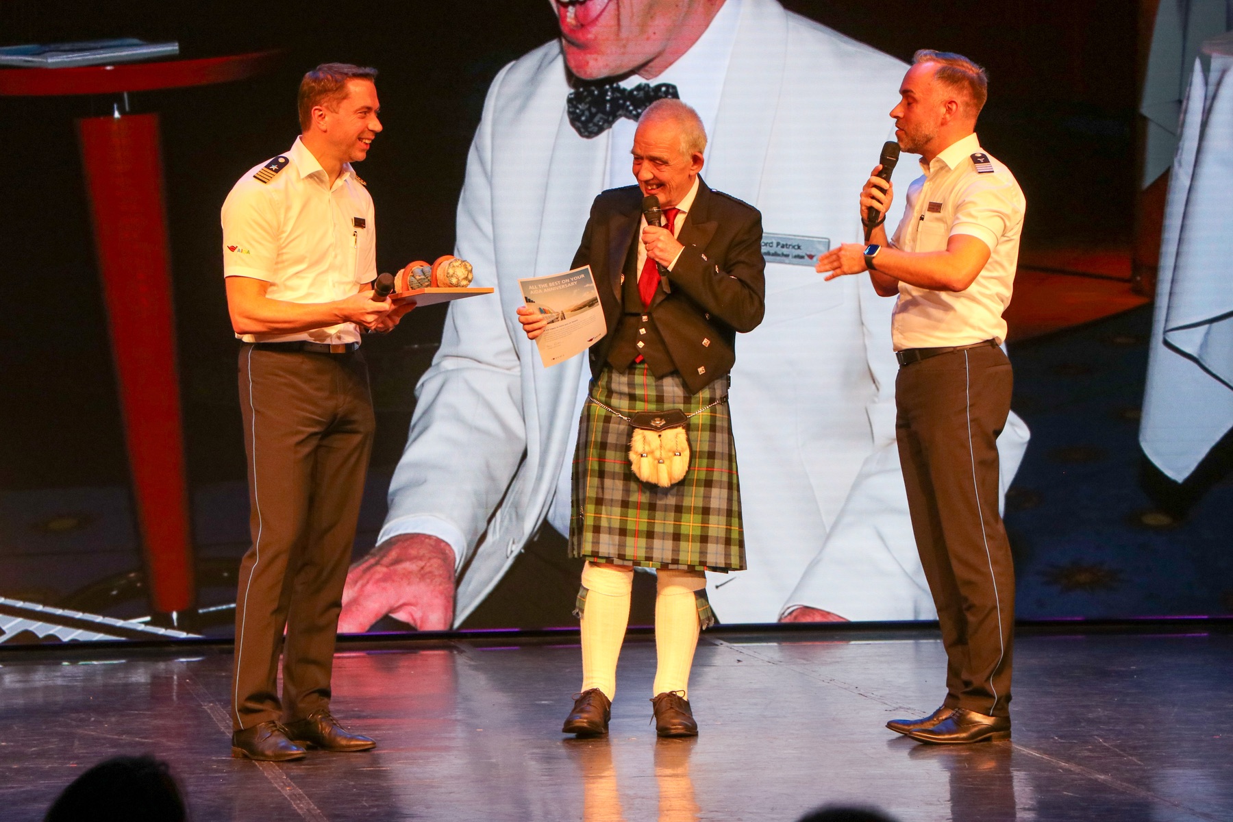 Der Travestiekünstler France Delon gratulierte ihm mit persönliche Erinnerungen aus deren gemeinsamer Zeit und mit einer Musikeinlage. Hoteldirektor Christoph Röder und Kapitän Tobias Wirsig überraschten den Lord Patrick mit einer Auszeichnung und einer Plakette vom 2003 der AIDAaura. Es war ein sehr schöner unterhaltsamer Abend.