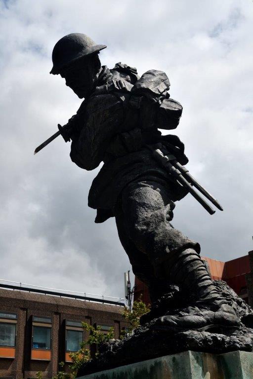 Nachdem wir in der vergangenen Stunde den alten Kern von Derry umrundet hatten, stießen wir in die Mitte dieses Kerns vor. Enge Straßen, schmale Bürgersteige, überschaubarer Autoverkehr, auf beiden Seiten Wohn- und Geschäftshäuser, ab und zu ein Inn. Die ins Zentrum führende Straße endete am Platz „The Diamond“ mit dem Denkmal für die im 1. Weltkrieg Gefallenen der Stadt.
