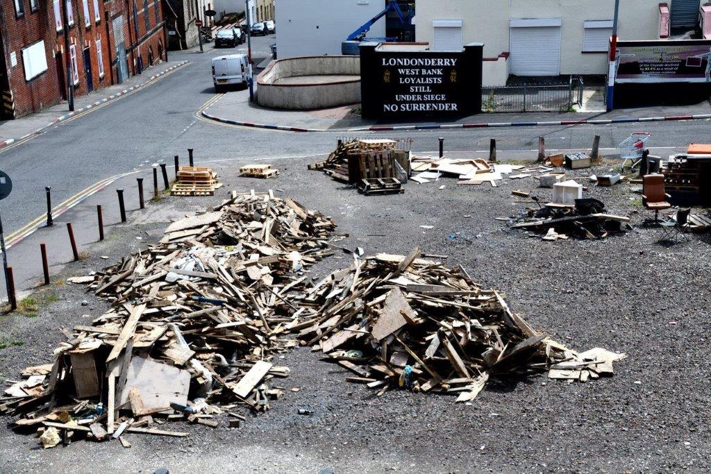 Ein Platz, noch spärlich gefüllt mit Holz und Holzpaletten, leider auch mit sonstigem Sperrmüll. Die Bordsteine der angrenzenden Straßen abwechselnd in rot, weiß und blau – die Farben der Flagge Großbritanniens. Ein Gedenkstein der Londonderry West Banks Loyalists: „immer noch unter Belagerung – keine Kapitulation“. Er erinnert an die endgültige Unterwerfung Irlands durch die Engländer, die am 11. Juli 1690 in der unter dem Sieger Wilhelm von Oranien gegen den katholischen, ehemaligen englischen König Jakob II in der Schlacht am Boyne besiegelt wurde. Jedes Jahr am 11. Juli, in der Bonfire Night, werden Palettenpyramiden angezündet – das Freudenfeuer und Paraden erinnern an diesen für die Loyalisten wichtigen Tag. Nicht unbedingt schlimm, wenn nur nicht immer wieder unerbittliche Ignoranten irisch-republikanische Symbole wie deren Nationalflagge ins Feuer werfen würden. Eine reine Provokation – hoffentlich lässt sich die Gegenseite nicht davon aufstacheln.