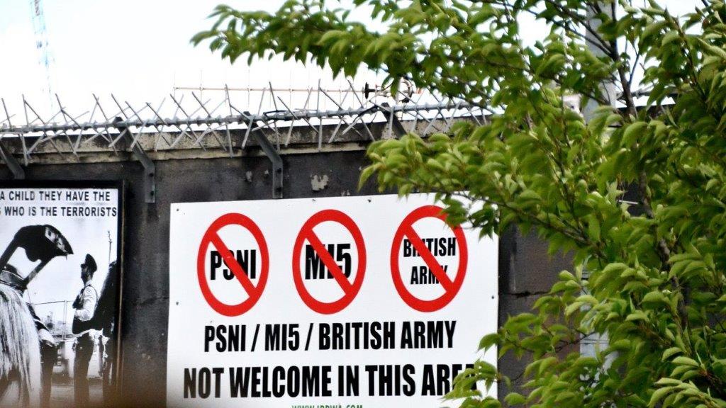 Die Ausläufer der Sperrin Mountains mussten „bezwungen“ werden. Und dann ging es wieder bergab. Bis wir Belfast erreichten und wir mit dem nächsten Programmpunkt Stadtrundfahrt Belfast „beglückt“ wurden. Zunächst kam das Pflichtprogramm jedes Belfast-Besuchers auf uns zu. Nicht die Friedensmauer sondern an diesem Tag die republikanische internationale Mauer an der Lower Falls Road, in der mehrheitlich katholische republikanische Iren wohnten. Allerdings nicht sehr weit von der von der Friedensmauer geprägten Shankill Road, die die Grenze zum vom protestantisch loyalistisch beeinflussten Shankill-Viertel bildete. Wie sehr in der Lower Falls Road bestimmte britische Institutionen willkommen sind, sieht man am folgenden Plakat: