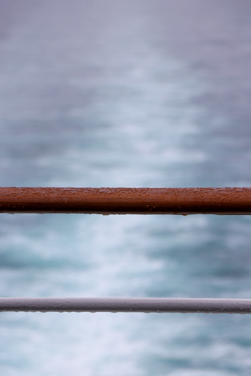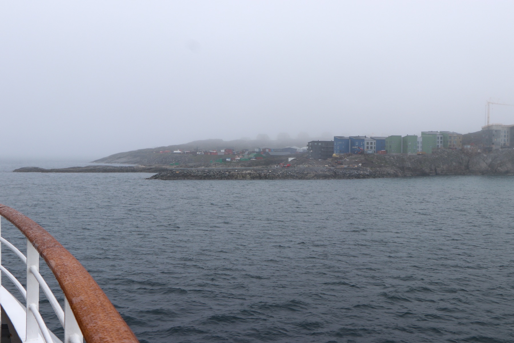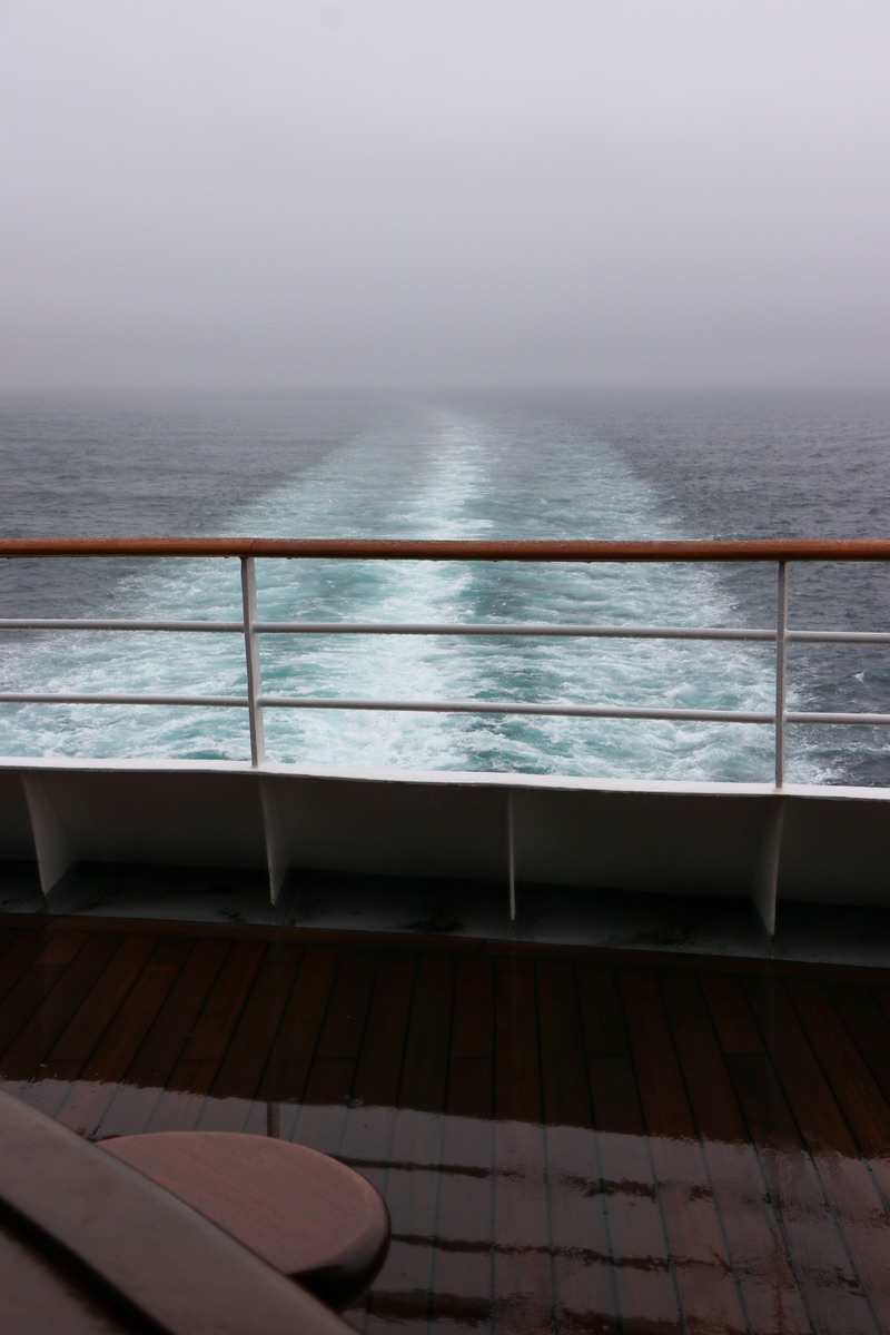 Zurück zum Schiff waren wir zum Auslaufen in der Ocean Bar und konnten vor Einsetzen des Regenwetters noch einmal auf Nuuk zurückblicken. Nach dem Auslaufen kam der Nebel und der Regen dazu, sodass die Stadt auf einmal nicht mehr zu sehen war.