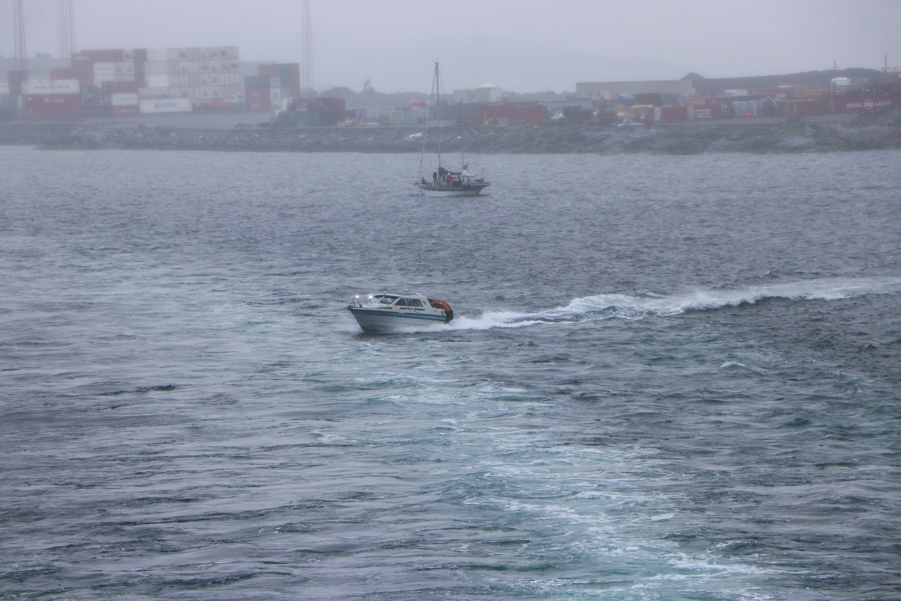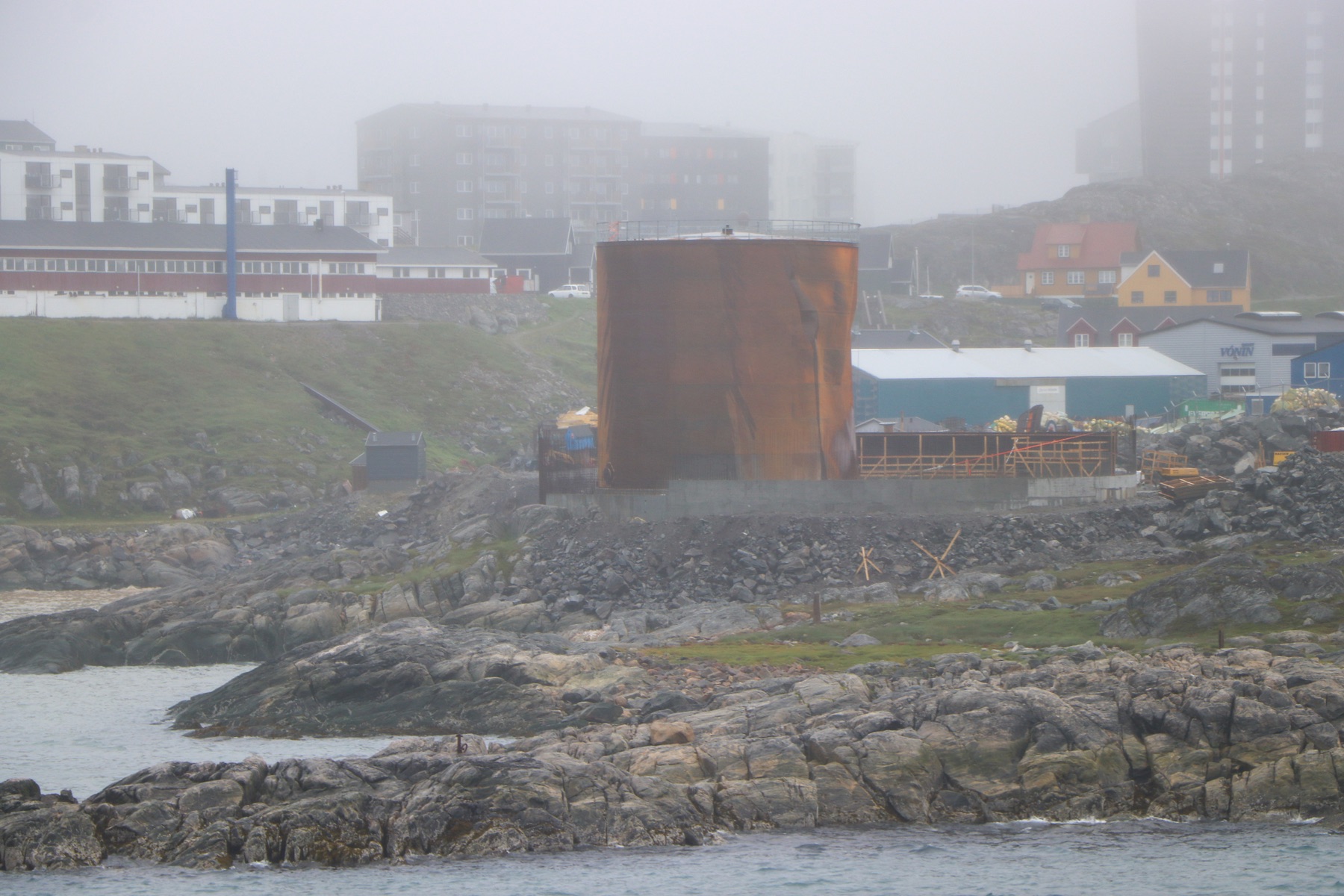 Zurück zum Schiff waren wir zum Auslaufen in der Ocean Bar und konnten vor Einsetzen des Regenwetters noch einmal auf Nuuk zurückblicken. Nach dem Auslaufen kam der Nebel und der Regen dazu, sodass die Stadt auf einmal nicht mehr zu sehen war.