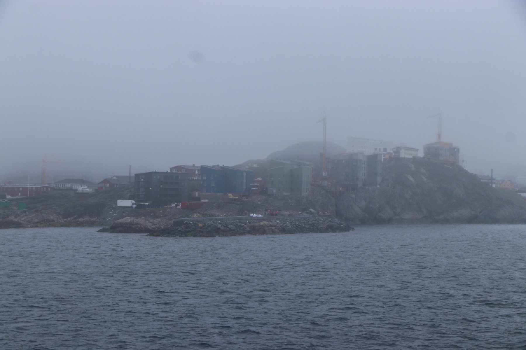 Zurück zum Schiff waren wir zum Auslaufen in der Ocean Bar und konnten vor Einsetzen des Regenwetters noch einmal auf Nuuk zurückblicken. Nach dem Auslaufen kam der Nebel und der Regen dazu, sodass die Stadt auf einmal nicht mehr zu sehen war.