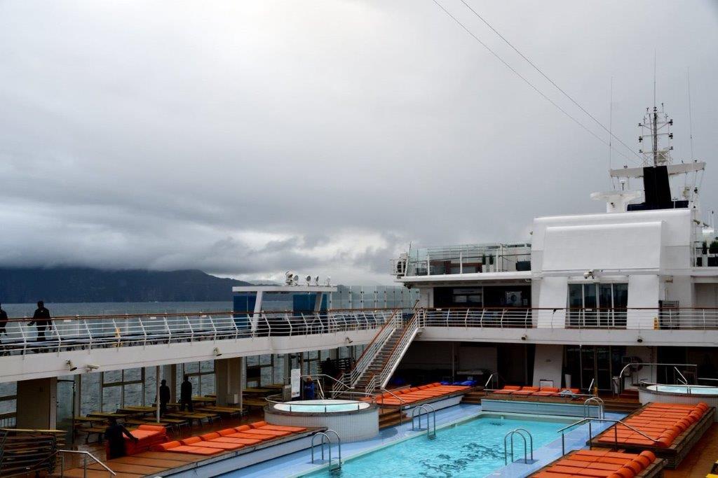 8 Uhr. Oben auf Deck 14. Wir fuhren parallel zur Küste Donegals. Die Spitzen der Berge waren von Wolken umhüllt.