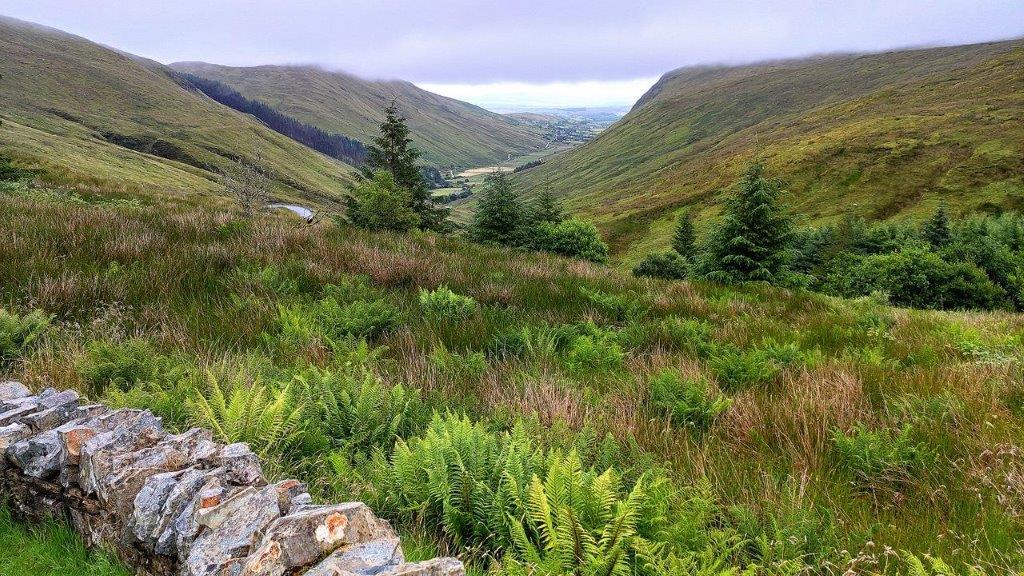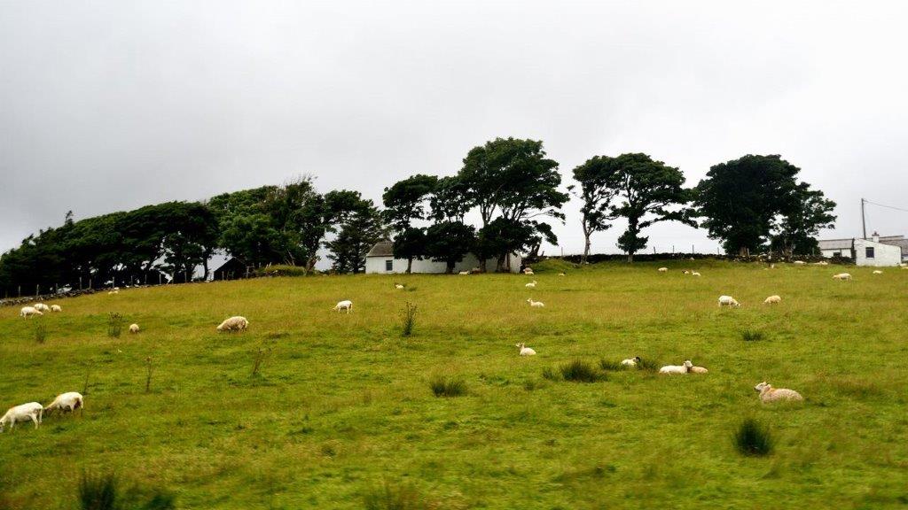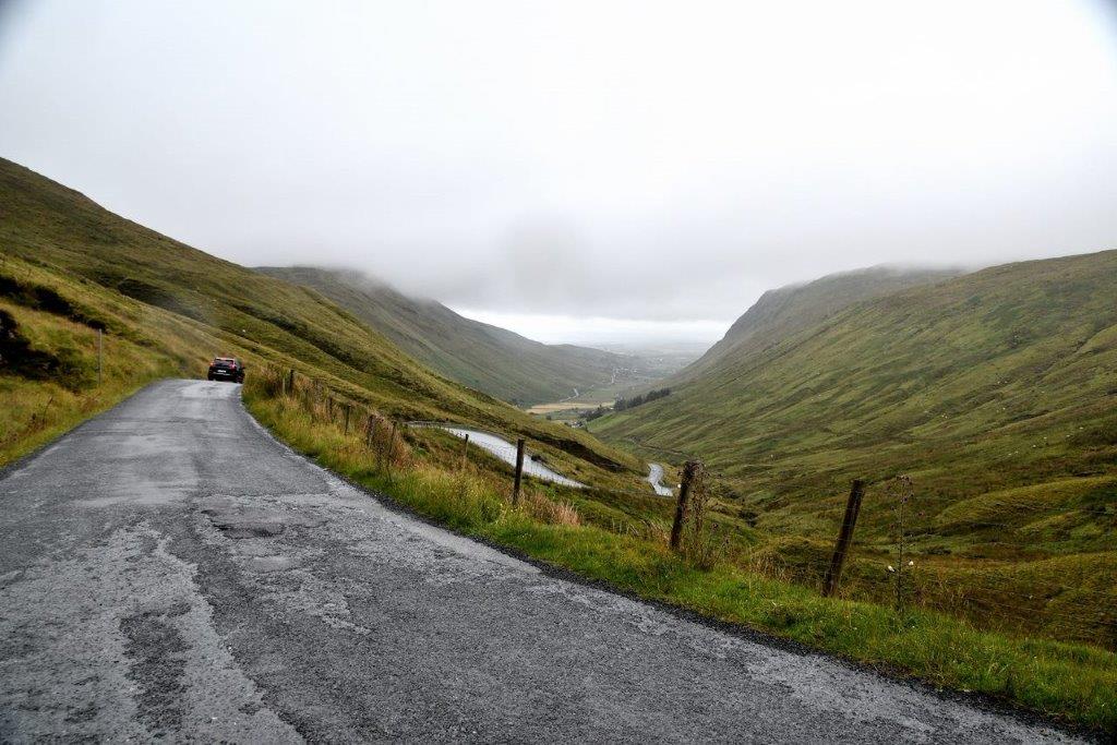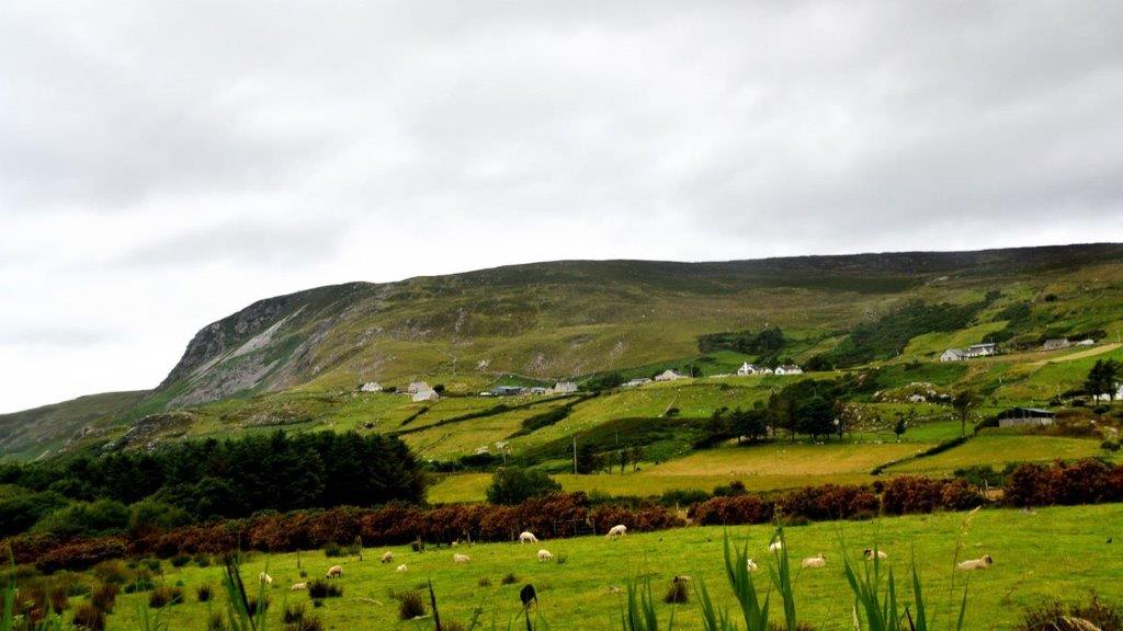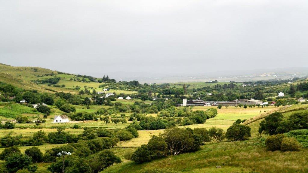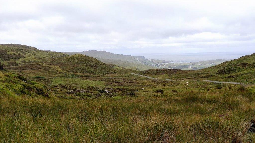 Links und rechts grüne Hänge der Crocknamurrin Mountain. Wiesen, Weiden mit vereinzelten Schafen, Binsen, Farne. Sonst nicht viel, soweit wir es durch die mit Regentropfen benetzten Fensterscheiben sehen konnten. Wir fuhren auf der ungefähr 25 km langen, die Orte Ardara und Glencolumbkille verbindenden mitunter engen Straße. Keine Ortschaften, wenige einsam gelegene Bauernhöfe. Und dann waren wir oben – auf der Höhe des Glengesh Passes. Mit 275 Höhenmetern nicht überragend hoch, aber die Ausblicke waren herrlich. Z.B. auf Ardara – ganz weit weg wirkend.