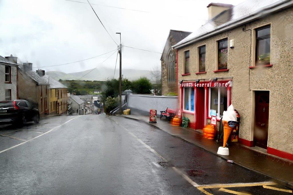 Weiter durch die nassen Busscheiben spähend erreichten wir unser erstes geplantes Ziel. Ardara, ein farbenfrohes Dorf mit noch nicht einmal 800 Einwohnern. Ein farbenfrohes malerisches Örtchen, das 2012 von der Irish Times zum schönsten Örtchens Irlands gewählt worden war. Das mussten wir uns bestätigen lassen! Geplant war ein Rundgang. Ja, geplant … aber der inzwischen stärker prasselnde Regen war nicht geplant. Und so änderten wir die Planung – wir ließen uns gefühlte 15 Minuten durch das Dorf kutschieren