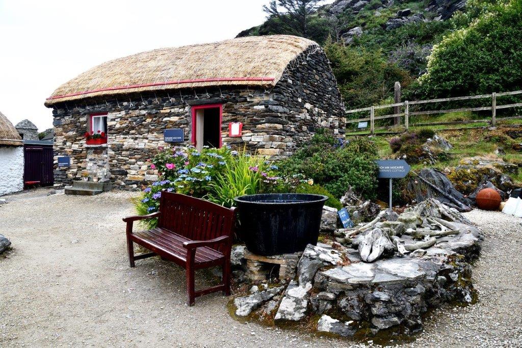 Es war einmal … nein, es gab einmal einen irischen katholischen Geistlichen, der Mitte des letzten Jahrhunderts nach Glencolumbkille zog. Er merkte sofort: „Hier ist nichts los“, krempelte die Ärmel hoch und begann etwas ganz Neues zu schaffen. Das Zauberwort hieß „Tourismus“ – aber zunächst nur im Kleinen. Inspiriert von einem Besuch des Freilichtmuseum Bunratty Folk Park (Besichtigung lohnt sich – ein ganz anderes Kaliber als Glencolmcille Folk Village) im Südwesten Irlands überzeugte er die Bewohner des Örtleins, eine zwischen den 18. Und 20. Jahrhunderts errichtete Handvoll Häuser aus der Umgebung so originalgetreu wie möglich wieder aufzubauen und mit Einrichtungs-/Haushaltsgegenständen aus der damaligen Zeit mit Leben zu erfüllen. Es gelang vorzüglich – Besucher aus nah und fern hielten an diesem gastlichen Ort.
