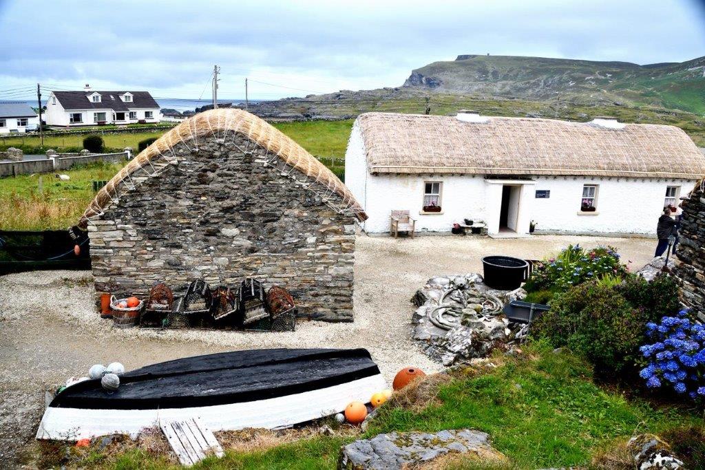 auf das rekonstruierte Fischerhaus, das Meer und die sich im Hintergrund ins Meer schiebende Bergzunge Glen Head. Auf ihr zu erkennen ein ehemaliger Signalturm aus napoleonischer Zeit. Einer von insgesamt 80 Türmen rund um die irische Küste; angelegt, um sich rechtzeitig auf französische Invasionen einzustellen.