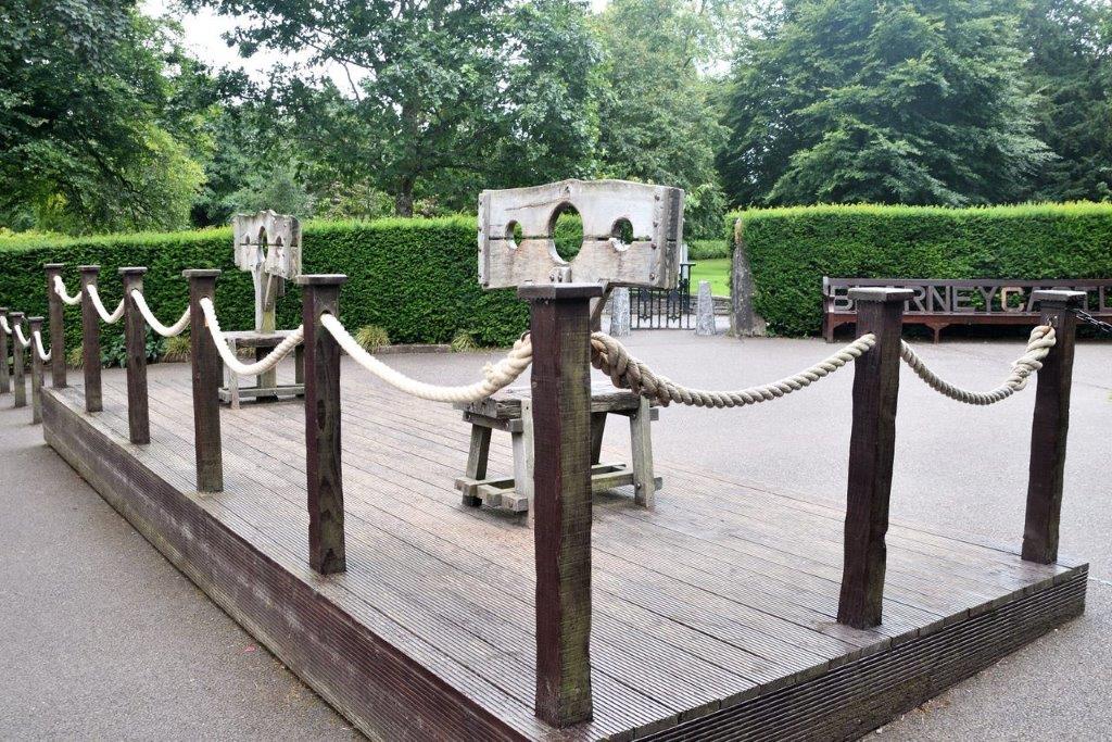 Nun aber endlich an die frische, wieder und noch trockene Luft. Wir wollten die uns zugestandenen 1 ½ Stunden Freizeit nicht im engen Turmaufgang verbringen sondern lieber die Gartenanlage genießen. Und beim Rundgang Kalorien abbauen. Vor dem Ausgang standen Vorrichtungen, die für die nicht auf die Obrigkeit Hörenden gedacht waren.