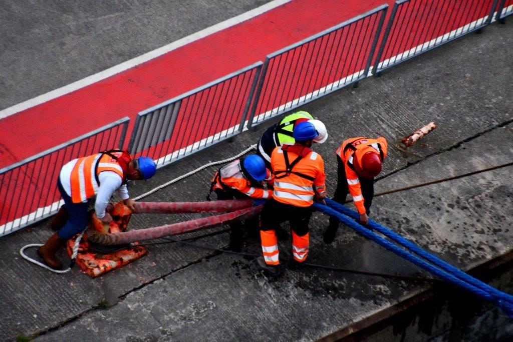 Noch eine halbe Stunde bis zum Festmachen. Es war nicht gerade kalt. 14°, bewölkt. Auch bei diesen nicht hohen Temperaturen kamen die Festmacher kräftig ins Schwitzen.