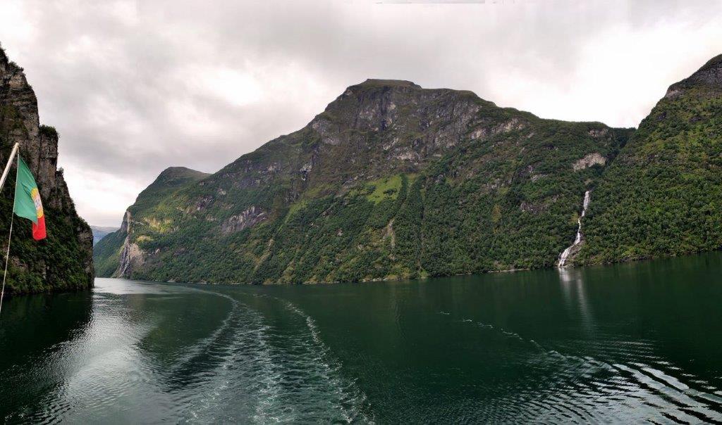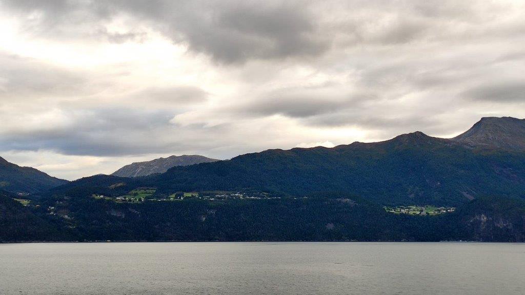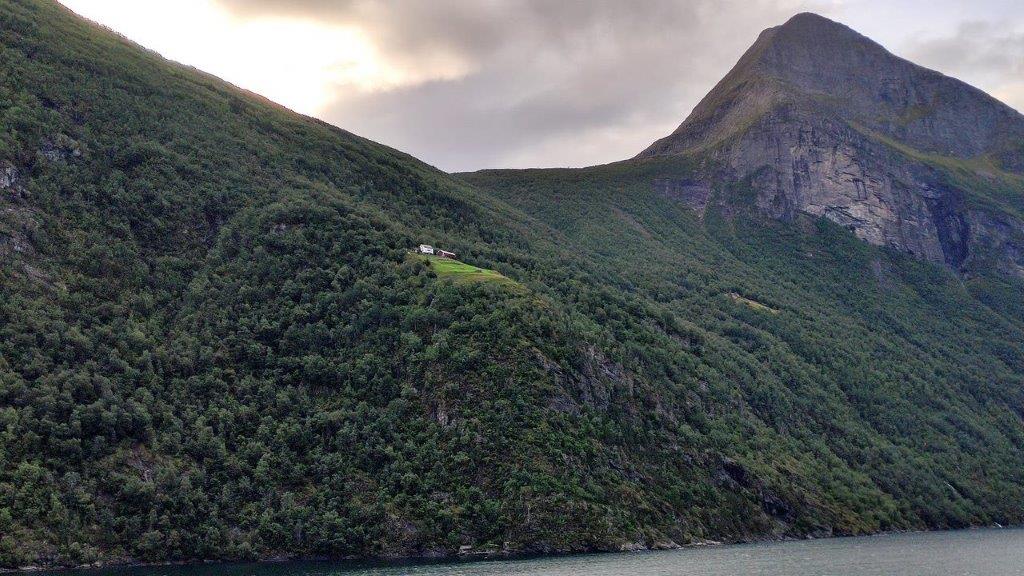 Kurz hinter Stranda verzweigte sich der Storfjord in den Sunnylvs- und dem Norddalsfjord. Unser Schiff fuhr weiter auf dem Sunnylvsfjord; er zeigte sich mit einer weitgehend unberührten Schönheit; mit der Zeit wurden die uns links und rechts begleitenden Berge höher und schroffer und die Durchfahrt enger. Die immer zahlreicher werdenden Mitreisenden an Deck wurden tief beeindruckt stiller und genossen die überwältigenden Ausblicke. Ab und zu tauchten oberhalb der Fjordufer Ortschaften auf.