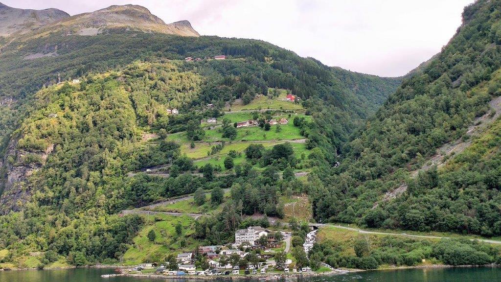 Das Traumziel vieler Nordlandfans. Besonders von Kreuzfahrtenliebhaber. An diesem Tag kamen lediglich zwei Dampfer zu Besuch. In den Vorjahren waren es oftmals mehr. So wurde Geiranger 2019 von 222 Anläufen heimgesucht (2021: 25; 2018: 187; 2022: 140; 2023: geplant 160; geplant 2024:163). Gegenüber dem Beginn der Kreuzfahrten ein Aufschwung, wenn man bedenkt, dass 1869 das erste Kreuzfahrtschiff aus England in den Fjord kam. Im Folgejahr waren es immerhin schon sechs Schiffe; 1920 stolze 112. Nur im Sommer ist an diesem Fjordende richtig etwas los. Dann steigt die Einwohnerzahl um 500 Kräfte zur Bedienung des Tourismus´ auf stattliche ca. 800. Und im Winter? Tote Hose …