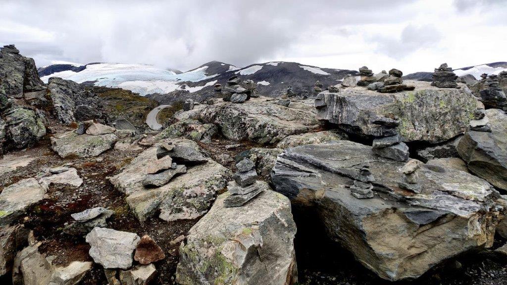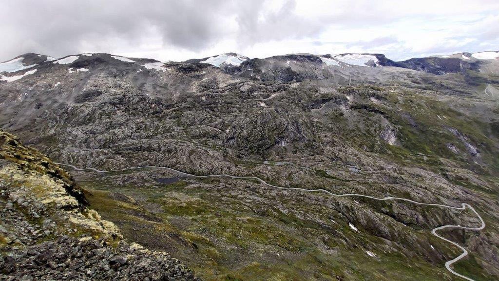 Je höher wir kamen desto felsiger wurde die Umgebung. Die steilen Anstiege waren vorbei, sollten aber wieder kommen. Wir erreichten den Ausläufer eines Gletschersees, den Djupvatnet. Von dort aus wurde es noch spektakulärer. Auf dem Nibbevegen, eine mautpflichtige Straße, die mit zig Spitzkurven ca. 440 Höhenmeter bezwingt und auf den höchsten Punkt Norwegens führt, der über eine Autostraße erreichbar ist. Knapp 100 Jahre ist der Nibbevegen alt; anfangs eine einfache Schotterstrecke, die vor mehr als einem Jahrzehnt asphaltiert wurde. Und schon waren wir oben nach einer atemberaubenden Fahrt. Oben auf dem 1.446 m hohen Dalsnibba. Und raus aus dem Bus und über den großen Parkplatz hin zum Skywalk. Ein Aussichtspunkt mit Gittern als Boden. Als weiteren Schutz Glasgeländer. Man meinte, über Berg- und Fjordwelt zu schweben. Wahnsinn … das, was man von oben genießen konnte …