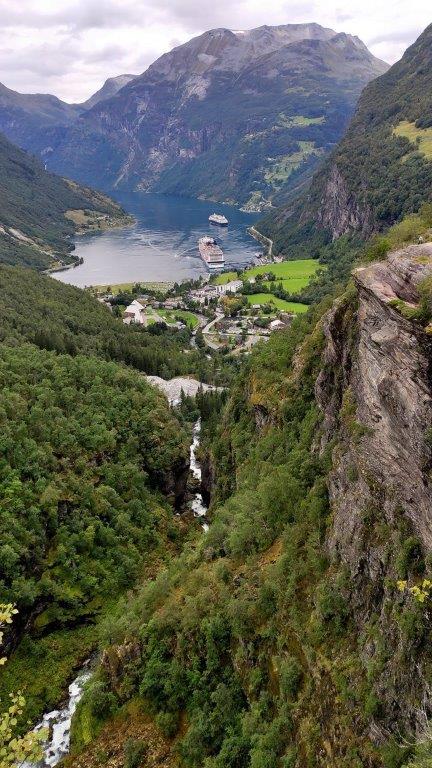 Kurz hinter Stranda verzweigte sich der Storfjord in den Sunnylvs- und dem Norddalsfjord. Unser Schiff fuhr weiter auf dem Sunnylvsfjord; er zeigte sich mit einer weitgehend unberührten Schönheit; mit der Zeit wurden die uns links und rechts begleitenden Berge höher und schroffer und die Durchfahrt enger. Die immer zahlreicher werdenden Mitreisenden an Deck wurden tief beeindruckt stiller und genossen die überwältigenden Ausblicke. Ab und zu tauchten oberhalb der Fjordufer Ortschaften auf.