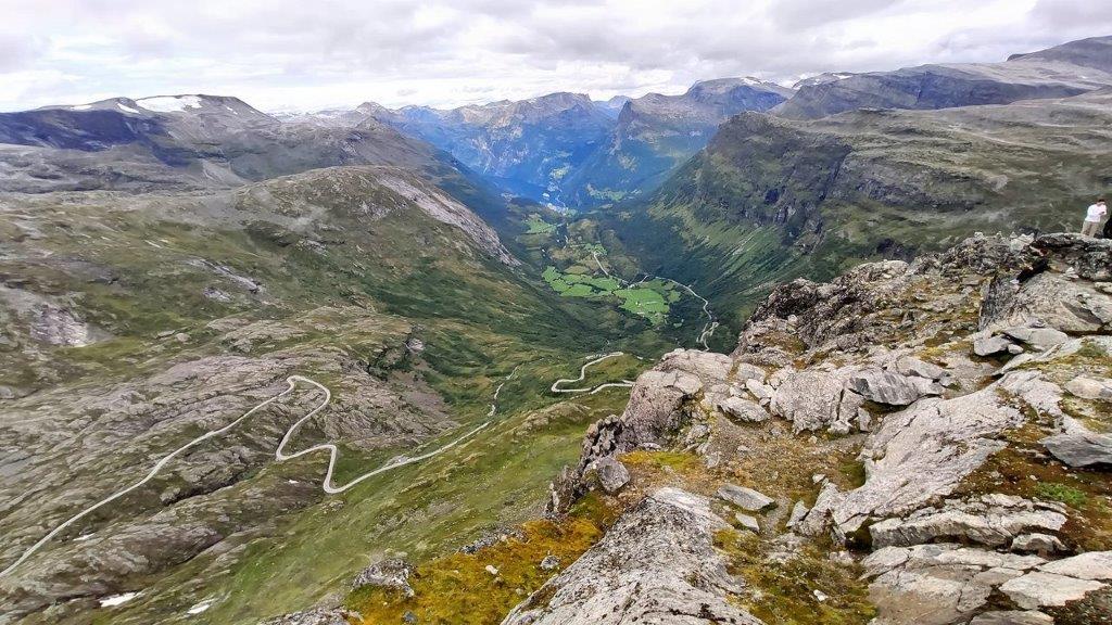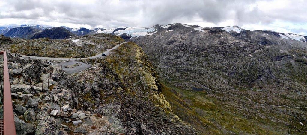Je höher wir kamen desto felsiger wurde die Umgebung. Die steilen Anstiege waren vorbei, sollten aber wieder kommen. Wir erreichten den Ausläufer eines Gletschersees, den Djupvatnet. Von dort aus wurde es noch spektakulärer. Auf dem Nibbevegen, eine mautpflichtige Straße, die mit zig Spitzkurven ca. 440 Höhenmeter bezwingt und auf den höchsten Punkt Norwegens führt, der über eine Autostraße erreichbar ist. Knapp 100 Jahre ist der Nibbevegen alt; anfangs eine einfache Schotterstrecke, die vor mehr als einem Jahrzehnt asphaltiert wurde. Und schon waren wir oben nach einer atemberaubenden Fahrt. Oben auf dem 1.446 m hohen Dalsnibba. Und raus aus dem Bus und über den großen Parkplatz hin zum Skywalk. Ein Aussichtspunkt mit Gittern als Boden. Als weiteren Schutz Glasgeländer. Man meinte, über Berg- und Fjordwelt zu schweben. Wahnsinn … das, was man von oben genießen konnte …