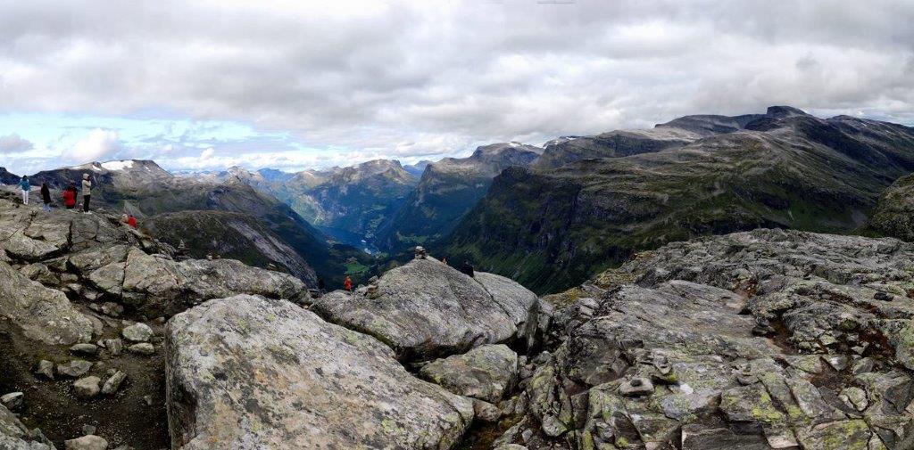 Es wurden uns leider nur 20 Minuten auf dem zügigen Hochplateau zugestanden und wir nutzten sie voll aus. Die Felslandschaft und über allem immer wieder der Geirangerfjord.