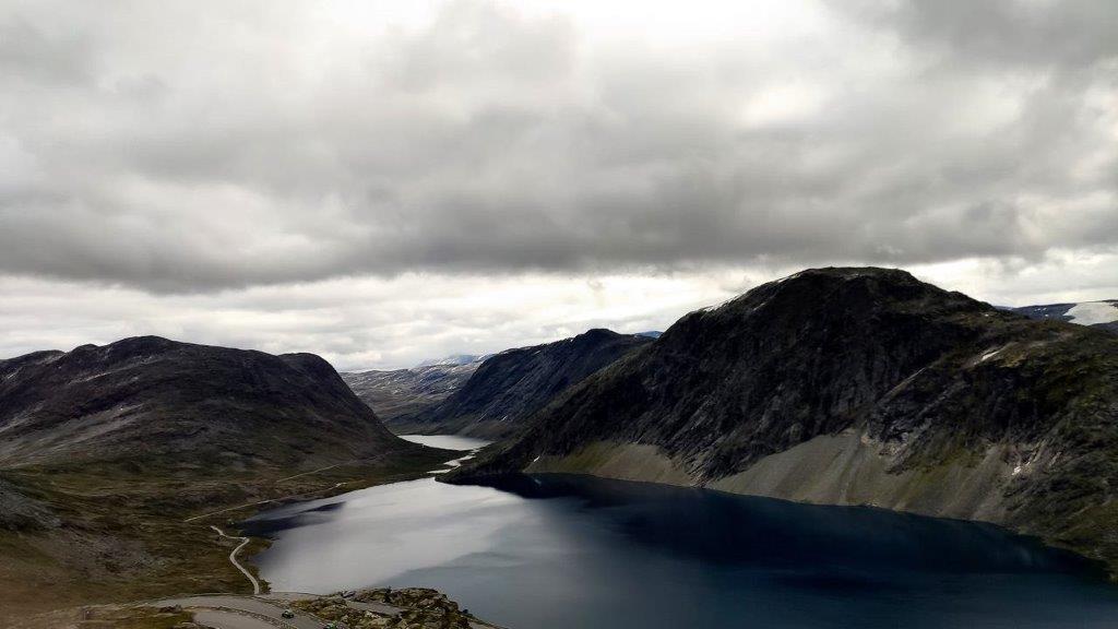 Die 20 Minuten Aufenthalt auf dem Dalsnibba lagen hinter uns und wir saßen wieder im Bus, der in 15 Minuten auf dem Nibbevegen nach unten fuhr. Wieder mit herrlichen Blicken auf See und Gebirge. Auf den von Bergen umrahmten See Djupvatn, dessen Oberfläche silbern glänzte.