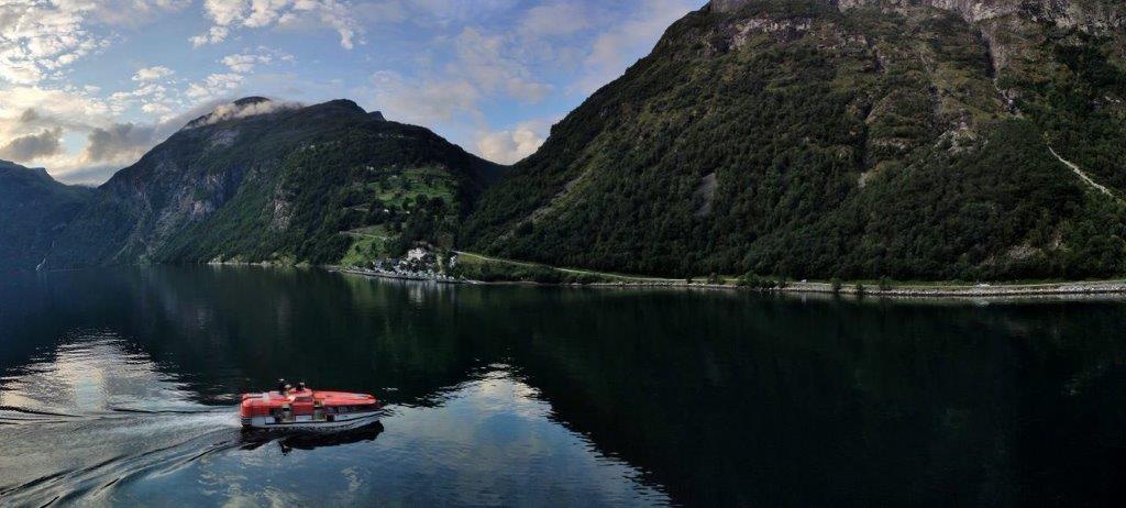 Das Fjordende, der Ort Geiranger, der Dalsnibba, Berge im Hintergrund mit Schneeresten oder auch kleinen Gletscherstücken, … Nur etwas störte, weil es sich ins Bild gefuscht hatte …