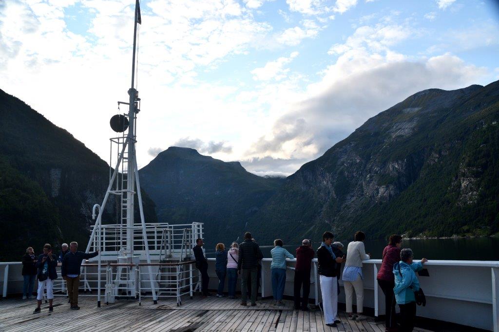 Rechtzeitig vor dem Ablegen wurde ein besonderes Schmankerl angekündigt. Während der Fahrt durch den Geirangerfjord sollte der ansonsten für Passagiere nicht zugelassene Bugbereich des Promenadendecks für alle zugänglich sein. Also nichts wie hin!