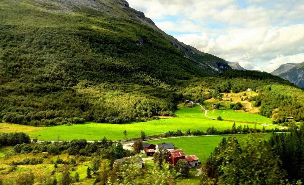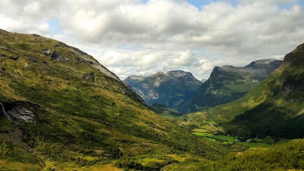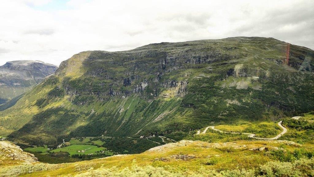 Die 20 Minuten Aufenthalt auf dem Dalsnibba lagen hinter uns und wir saßen wieder im Bus, der in 15 Minuten auf dem Nibbevegen nach unten fuhr. Wieder mit herrlichen Blicken auf See und Gebirge. Auf den von Bergen umrahmten See Djupvatn, dessen Oberfläche silbern glänzte.