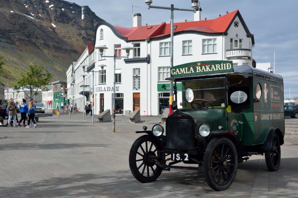 Am Schiff angekommen lag ein interessanter und empfehlenswerter Ausflug hinter uns und vor uns ein kurzer Spaziergang durch das ältere Viertel von Ísafjörður. Uns gefielen die farbigen Häuser, wobei das tief-lila-farbige Haus gewöhnungsbedürftig war. Aber immerhin ansprechender als der angrenzende Zweckbau. So, wie es aussah, werden Backwaren noch immer mit einem altertümlichen Vehikel geliefert.
