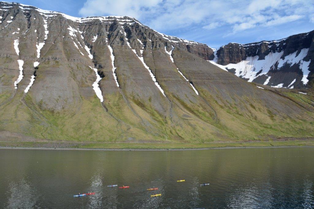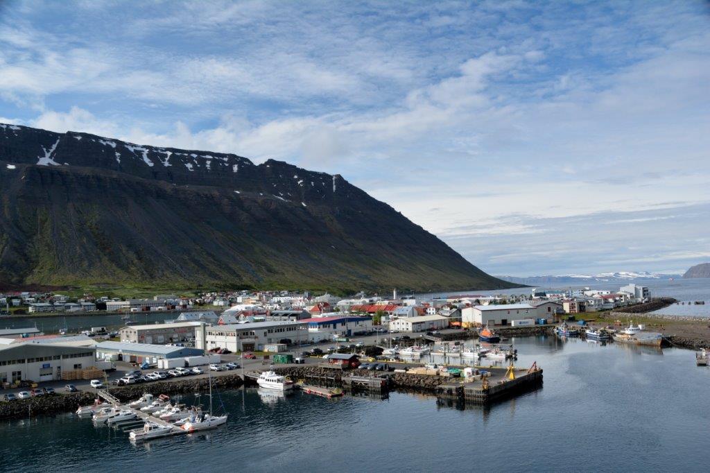 Kalt war´s … saukalt! Wir genossen lange die Fjordfahrt. Die Wolken schwebten herab und legten sich wie Sahnehäubchen auf die Tafelberge. Einfach nur schön! Hauptsache, wir fuhren Richtung blauen Himmels! Und so war es! Und es war Zeit für das Frühstück, das der Neunerclan gemeinsam zu sich nahm. Bis wir Ísafjörður in greifbarer Nähe hatten. Dann aber rauf – ganz nach oben. Dorthin, von wo aus wir den besten Überblick über die mit ca. 2.500 Einwohnern größte Stadt der Westfjorde, der europäischen Arktis, hatten.