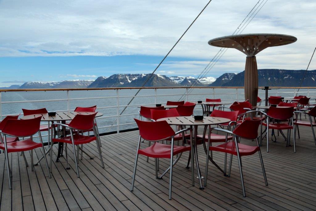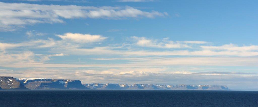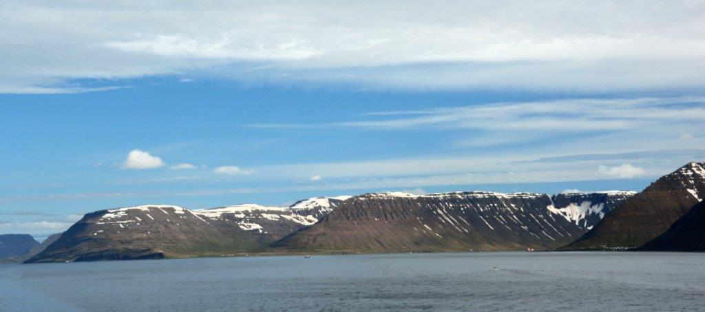 Der frühe Morgen. Er begann mit einem Frühe-Vogel-Kaffee. Lockte er? Machte er das rechtzeitige Aufstehen leichter? Egal, ob ja oder nein – er belebte. Die AIDAluna fuhr in den Ísafjarðardjúp (sprecht das mal aus …). Auf der Backbordseite waren nur tief liegende Wolken zu erkennen. Sonst nichts. Auf der Steuerbordseite eine Tafelgebirgskette – wie vom Schreiner abgehobelt. So gut wie keine Schneeflecken an und auf den Bergen.