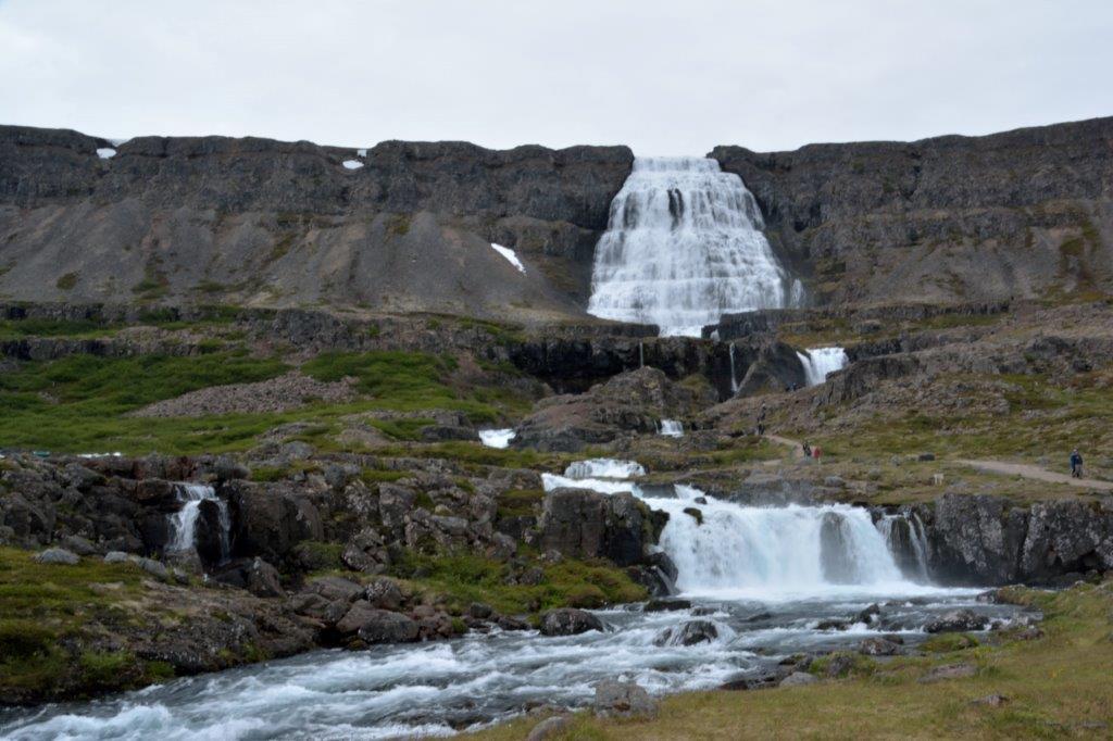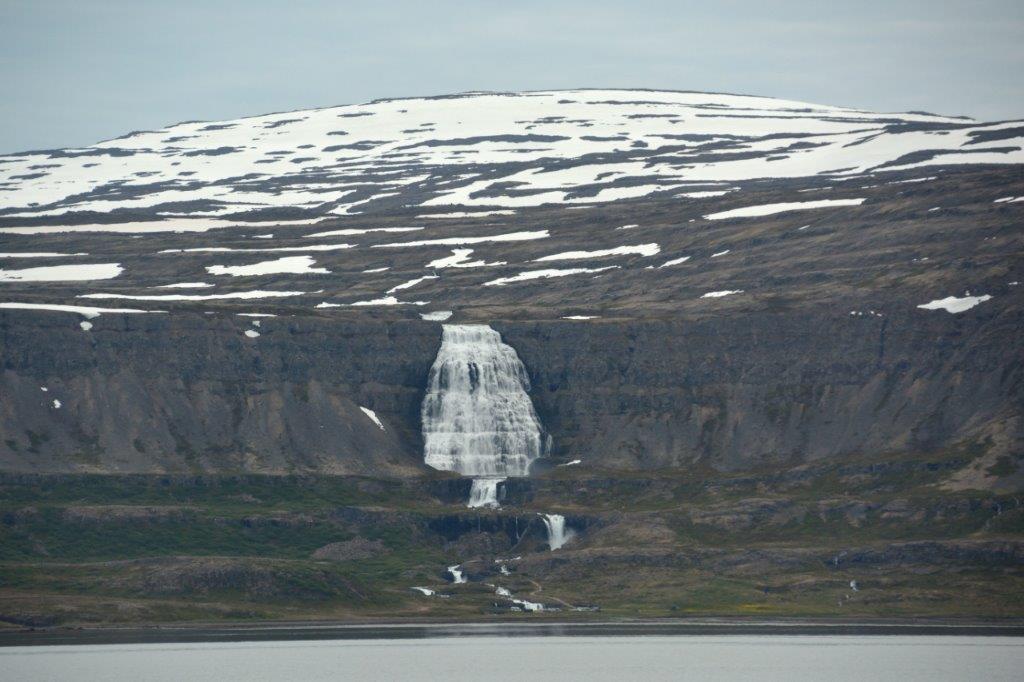 Weiter. Und zwar wie zuvor bergab. Dann über einen Damm und eine den Önundarfjörður überspannende Brücke. Der nächste zu bewältigende Bergrücken lag vor uns. Wir bzw. der Bus schafften ihn. Und wo es rauf ging, ging es wieder runter. Zum Dýrafjörður, den wir teilweise passierten und dann über Damm und Brückchen überquerten. Kurz vor Þingeyri mussten wir wieder einen die Fjorde trennenden Bergrücken bewältigen, um am Arnarfjörður zu „landen“. Erneut eine Fahrt entlang des Fjords. Und auf einmal sahen wir ihn auf der anderen Seite des Fjords – den Dynjandi, unser Ziel.