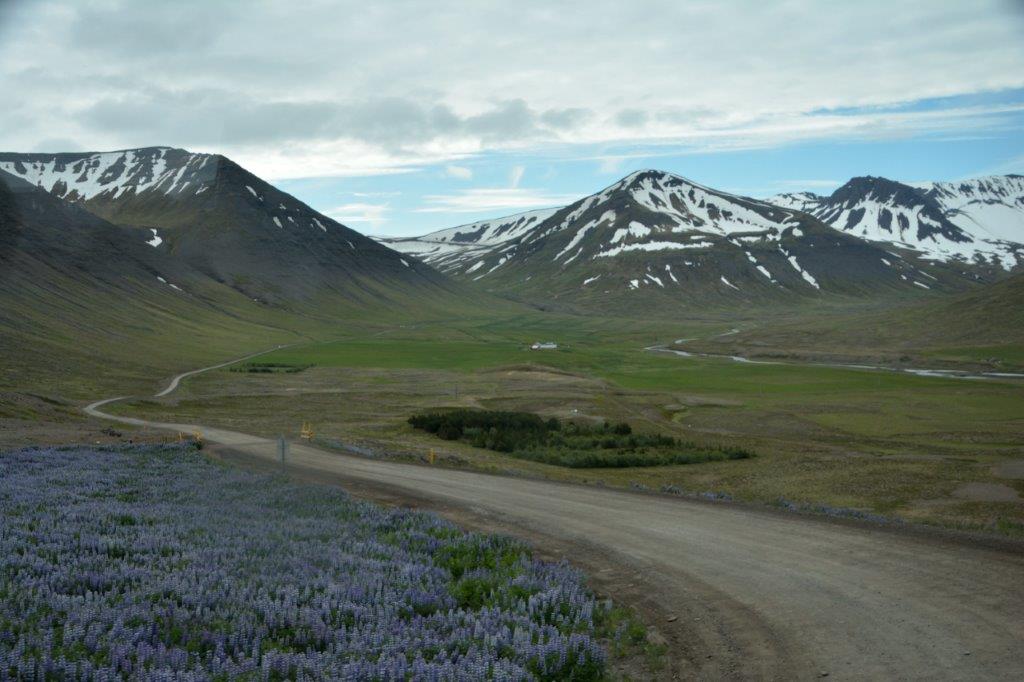 Was war das? Der Wagen ratterte auf einmal … keine Angst – kein Fahrzeugschaden … die Asphaltstraße ging in eine platt gefahrene Schotterpiste über. Gut, unser Fahrer drosselte die Geschwindigkeit. Aber nur ein wenig … Immer wieder die unzähligen arktischen Lupinen. Wunderschön …