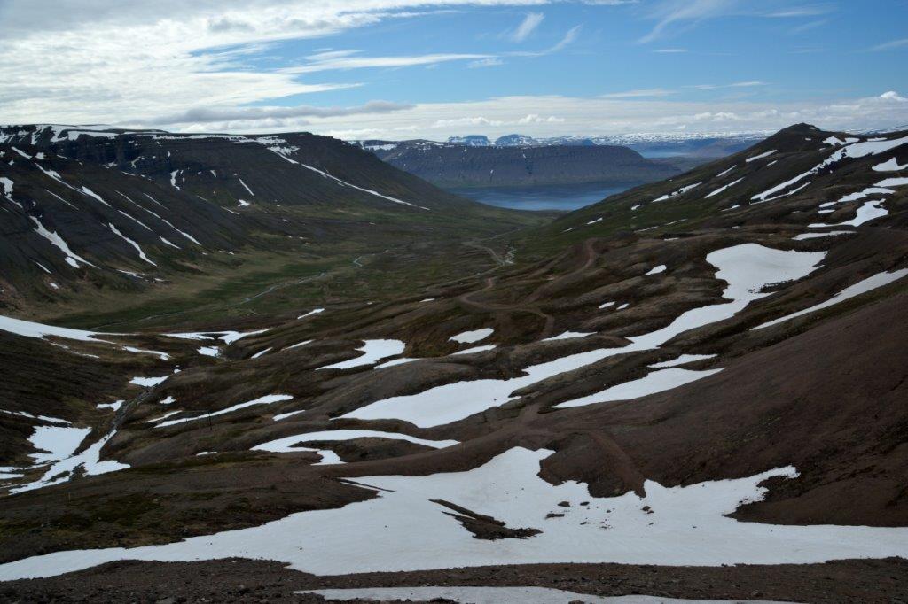 Auf einer gut ausgebauten Straße ging es allmählich bergauf und wir befanden uns recht schnell im längsten Tunnel Islands, dem Vestfjarðargöng, wieder. 9.120 m ist er lang – aber nicht an einem Stück. Nach zweispurigen 2.100 m teilt er sich auf – es gibt quasi eine Tunnelabzweigung. Rechts führt der eine 2.900 m lange Tunnel nach Suðureyri; die von uns - geradeaus – genommene Röhre Richtung Þingeyri ist 4.150 m lang. Und nunmehr einspurig mit Ausweichbuchten. Ungewöhnlich, aber problemlos. Vor allen Dingen aufgrund des nicht starken Verkehrs und der zurückhaltenden Fahrweise der Isländer. Irgendwann war der Tunnel geschafft und eine überwältigende Landschaft empfing uns. Felsen. Und Grün. Islandgrün. Und weite Schneefelder. Ab und zu ein Wasserfall.