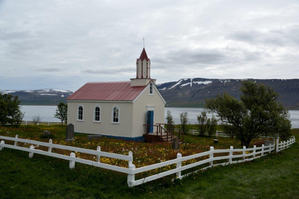 Und schließlich lag er vor uns. Rund 100 m hoch, oben 30 m und unten 60 m breit – ein sich auffächerndes Naturphänomen, das Wassermassen über viele Fallstufen tosend nach unten entließ. Die kleine Anstrengung des kurzen Anstiegs hatte sich gelohnt – es war überwältigend. Und von dem von uns erreichten höchsten Standort hatten wir einen wunderschönen Ausblick auf den weiteren Verlauf des Dynjandi. Wasser, Fjord und Berge. Verweile doch, Du bist so schön … Aber nix da, wir mussten zurück. Zunächst in den Bus und dann wieder über die Piste. Auf demselben Weg, aber mit weiteren Fotostopps. Zunächst an einem steinigen Strand. Muschelsuche. Wir wurden fündig. Der nächste Halt am Rande des Ortes Hrafnseyri. Dort, wo der restaurierte Geburtshof des isländischen Freiheitskämpfers Jón Sigurðsson (1811-1879) zu besichtigen war wie auch die daneben stehende unscheinbare und schlichte kleine Kapelle.